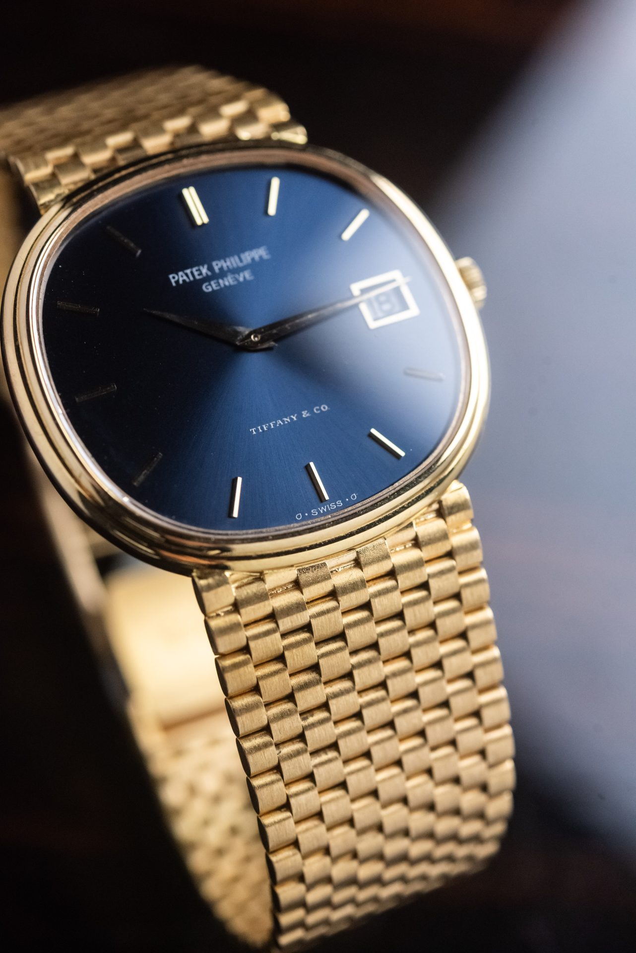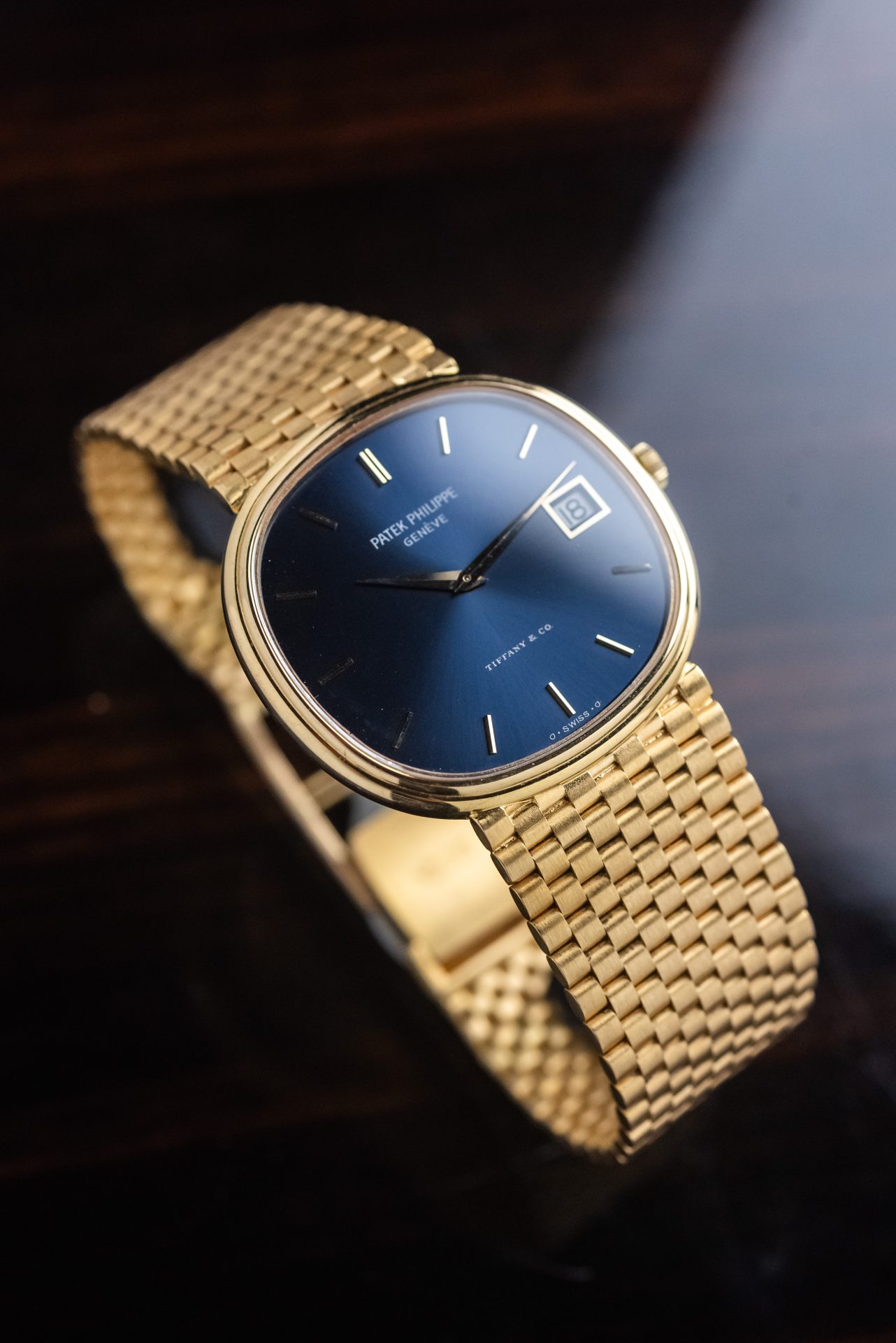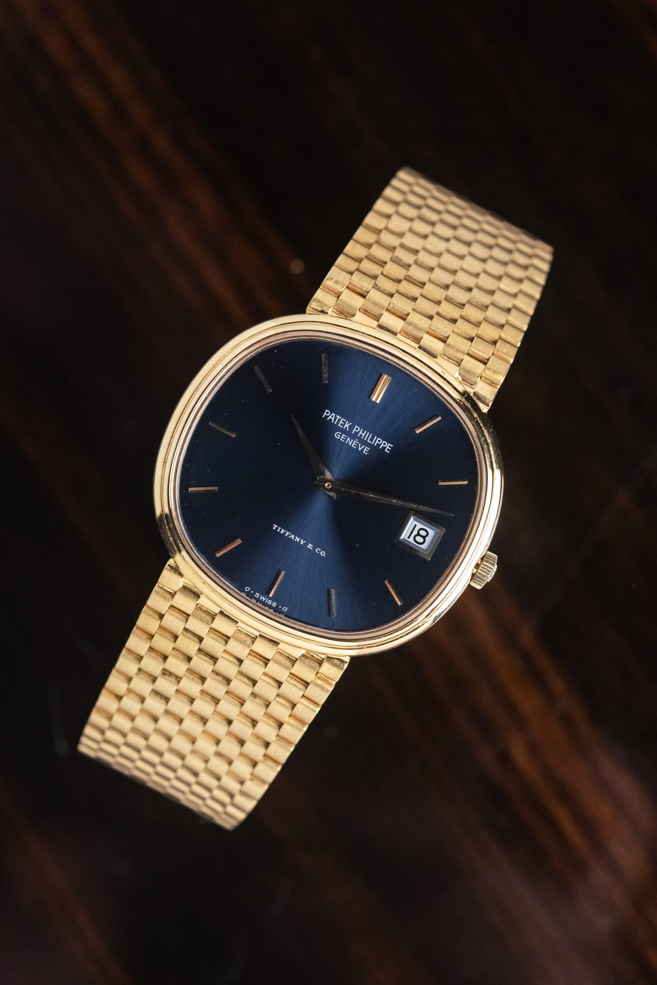 Elegant and rare Patek Philippe Golden Ellipse in 18kt yellow gold with a blue sunburst dial and double Tiffany & Co. signature, a configuration particularly sought-after by collectors.