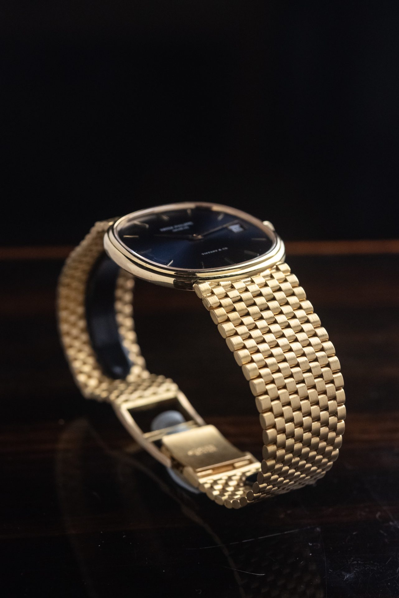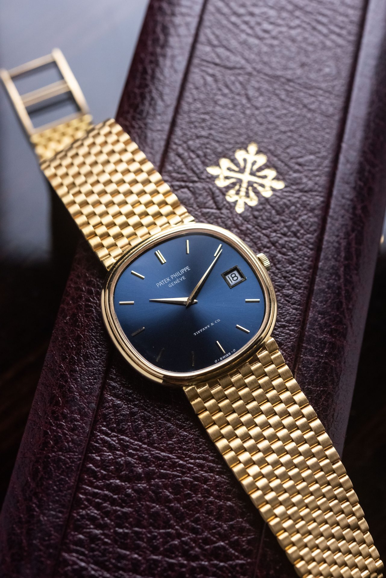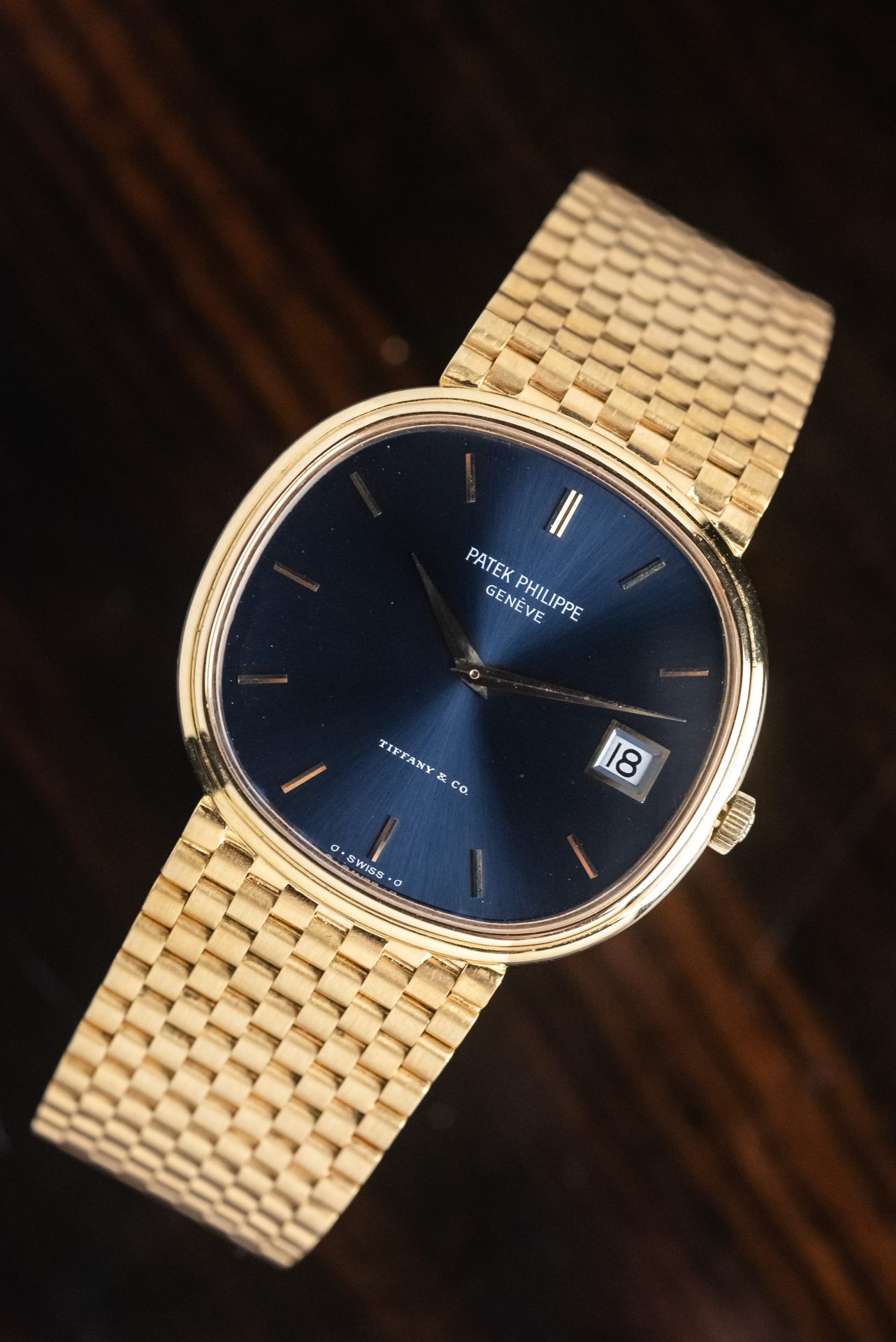 Elegant and rare Patek Philippe Golden Ellipse in 18kt yellow gold with a blue sunburst dial and double Tiffany & Co. signature, a configuration particularly sought-after by collectors.