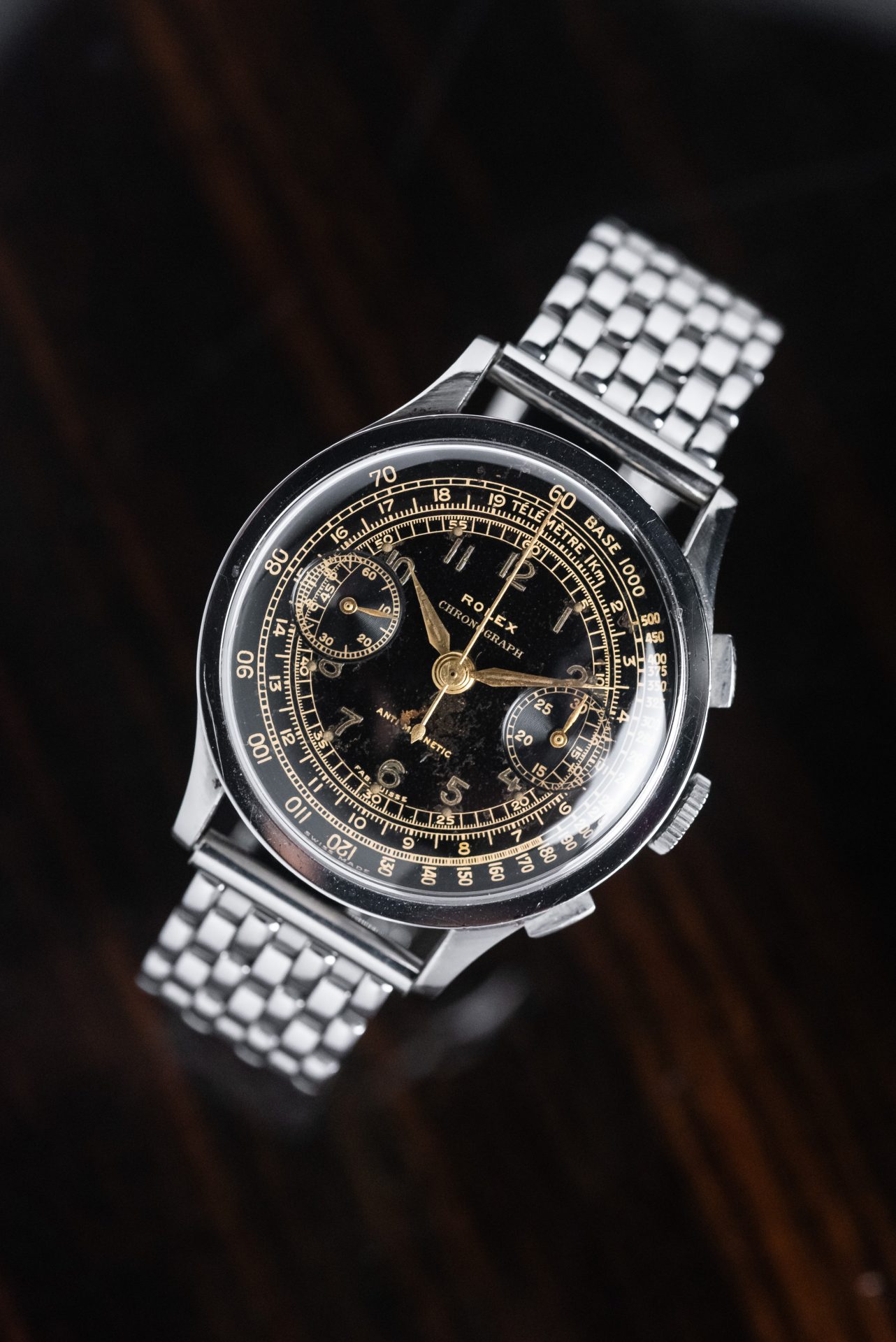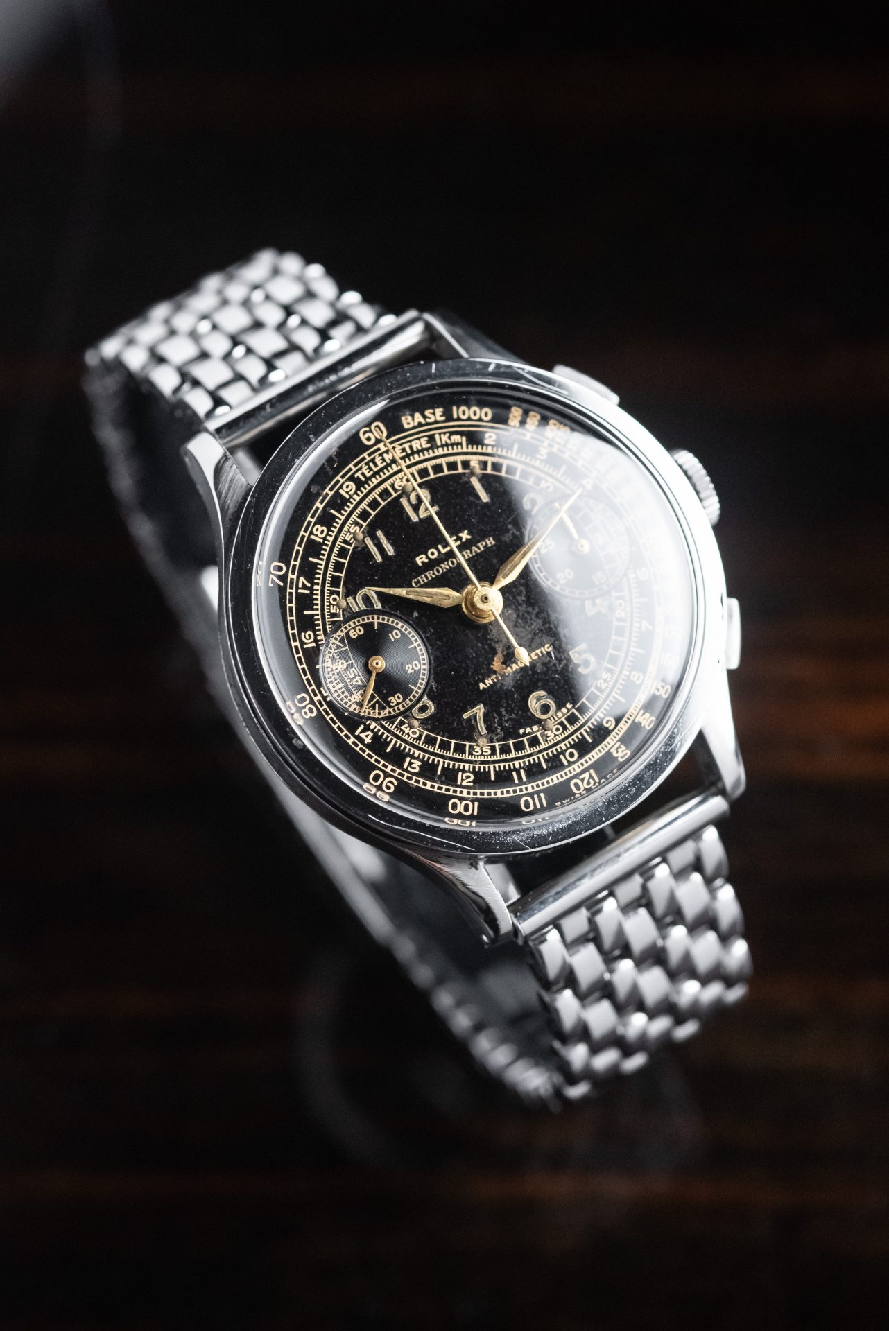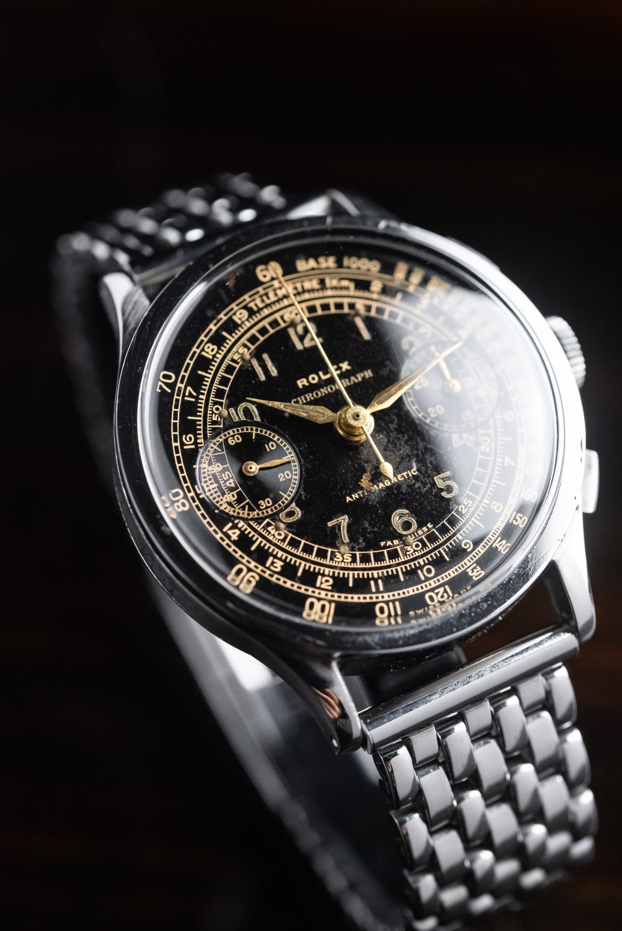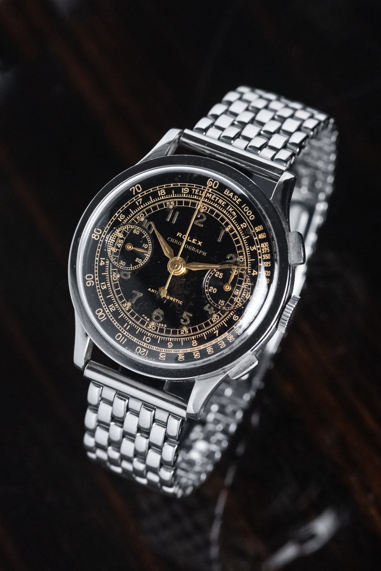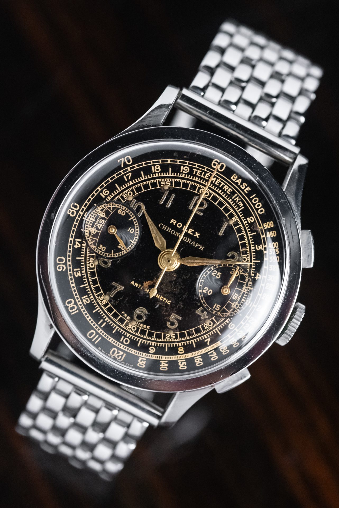 Timeless elegance and vintage charm: this Rolex 2508 is one of the most sought-after chronographs among enthusiasts. With its black gilt dial adorned with tachymeter and telemeter scales, it perfectly embodies the style and technology of the 1940s.