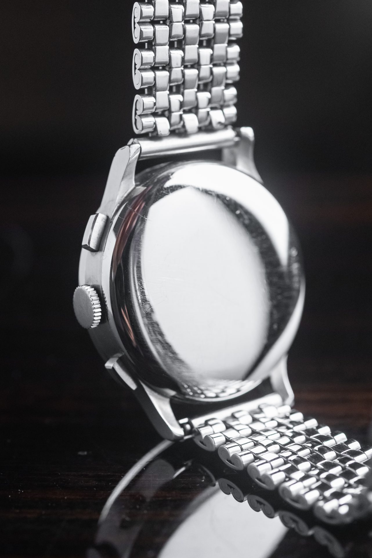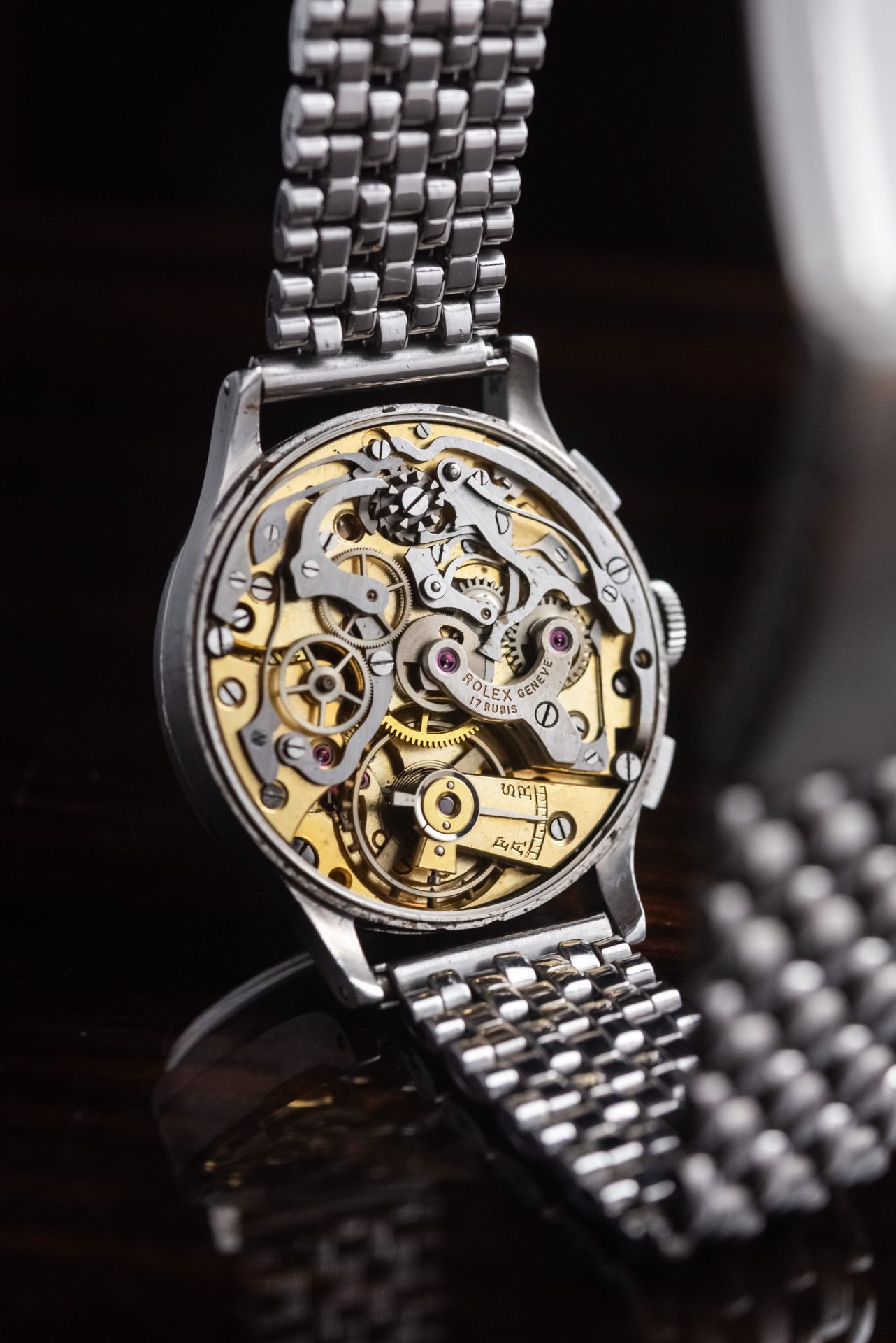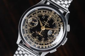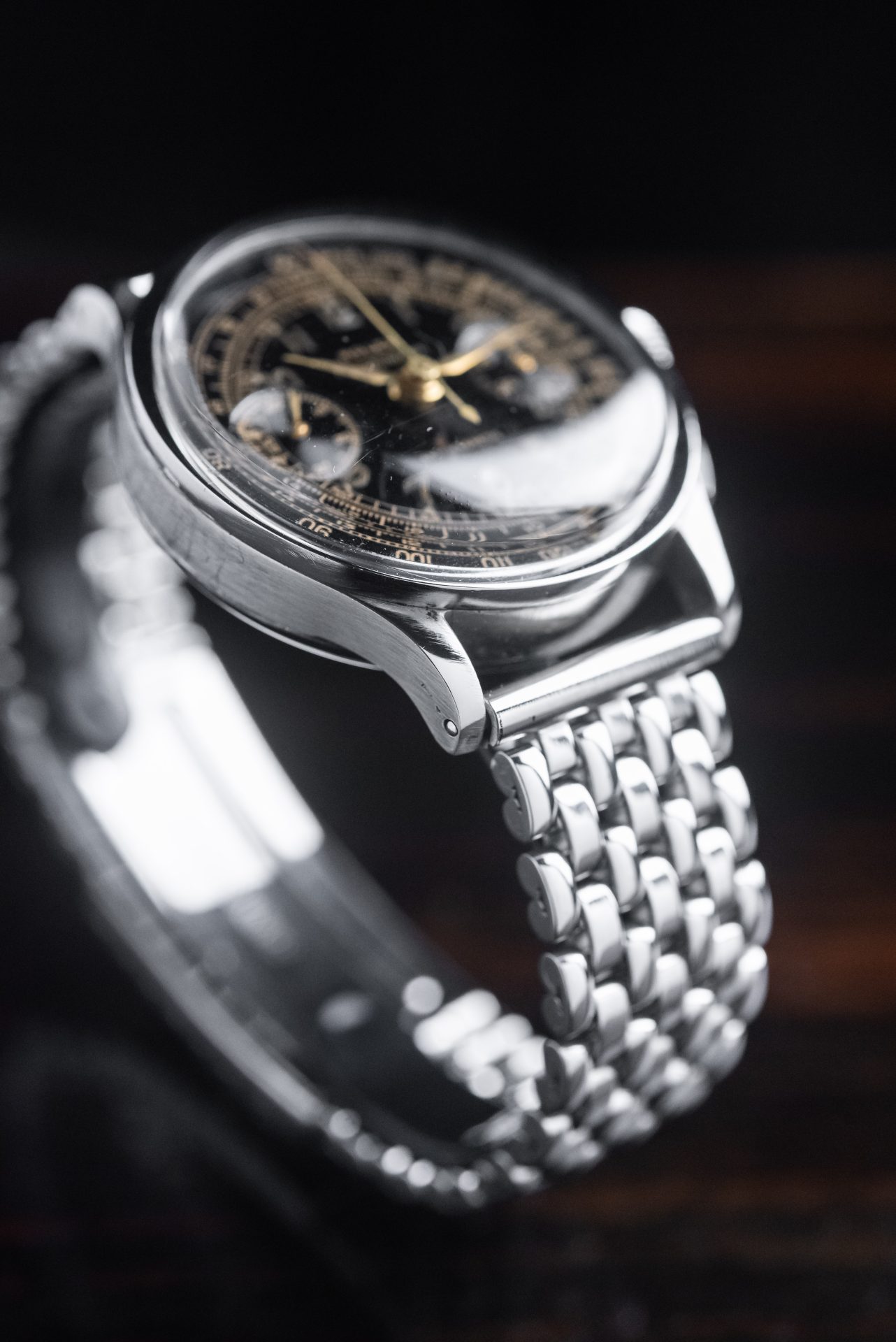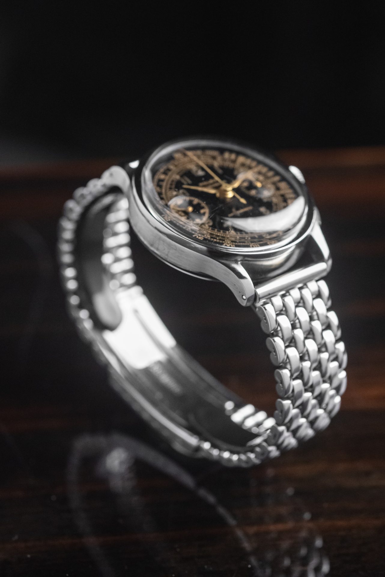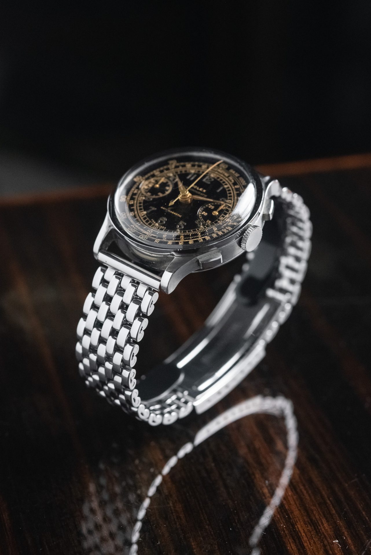 Timeless elegance and vintage charm: this Rolex 2508 is one of the most sought-after chronographs among enthusiasts. With its black gilt dial adorned with tachymeter and telemeter scales, it perfectly embodies the style and technology of the 1940s.