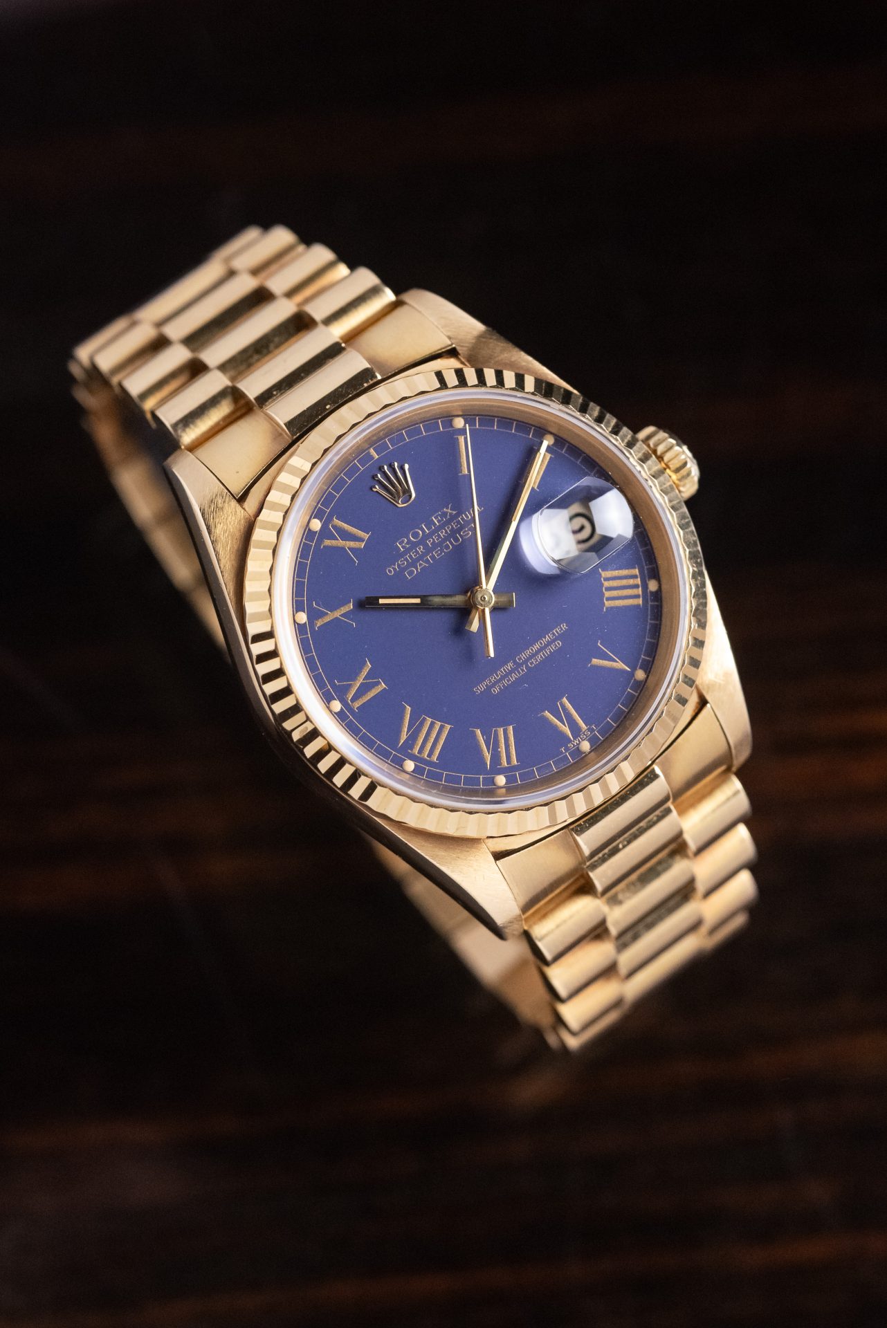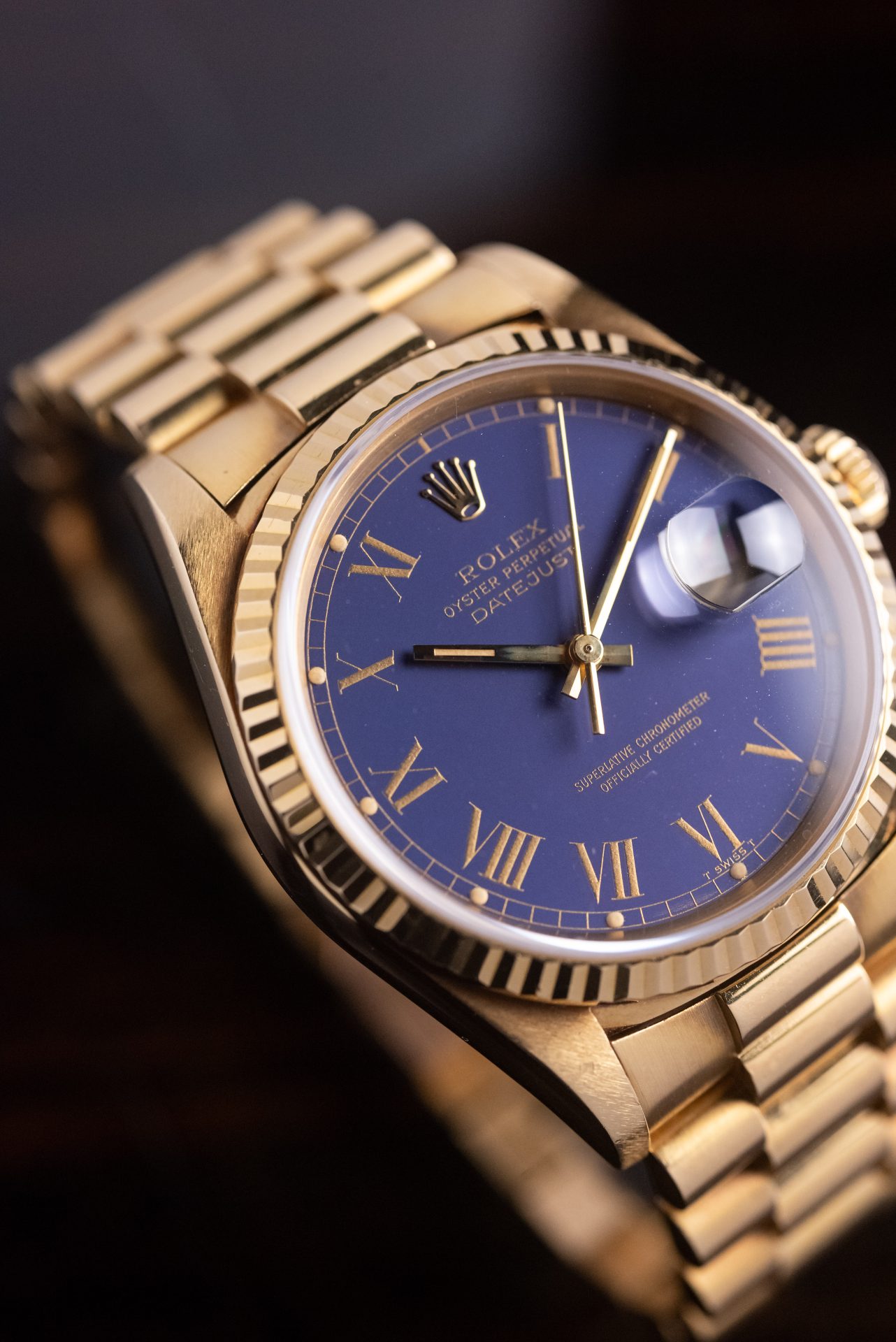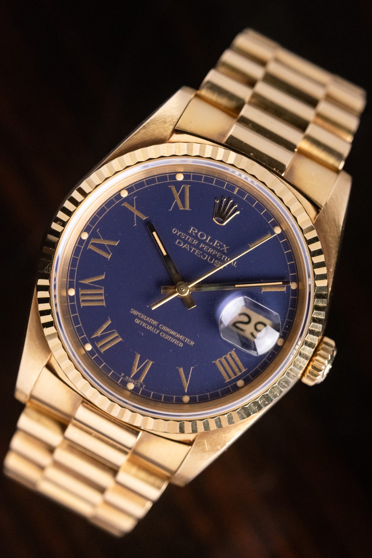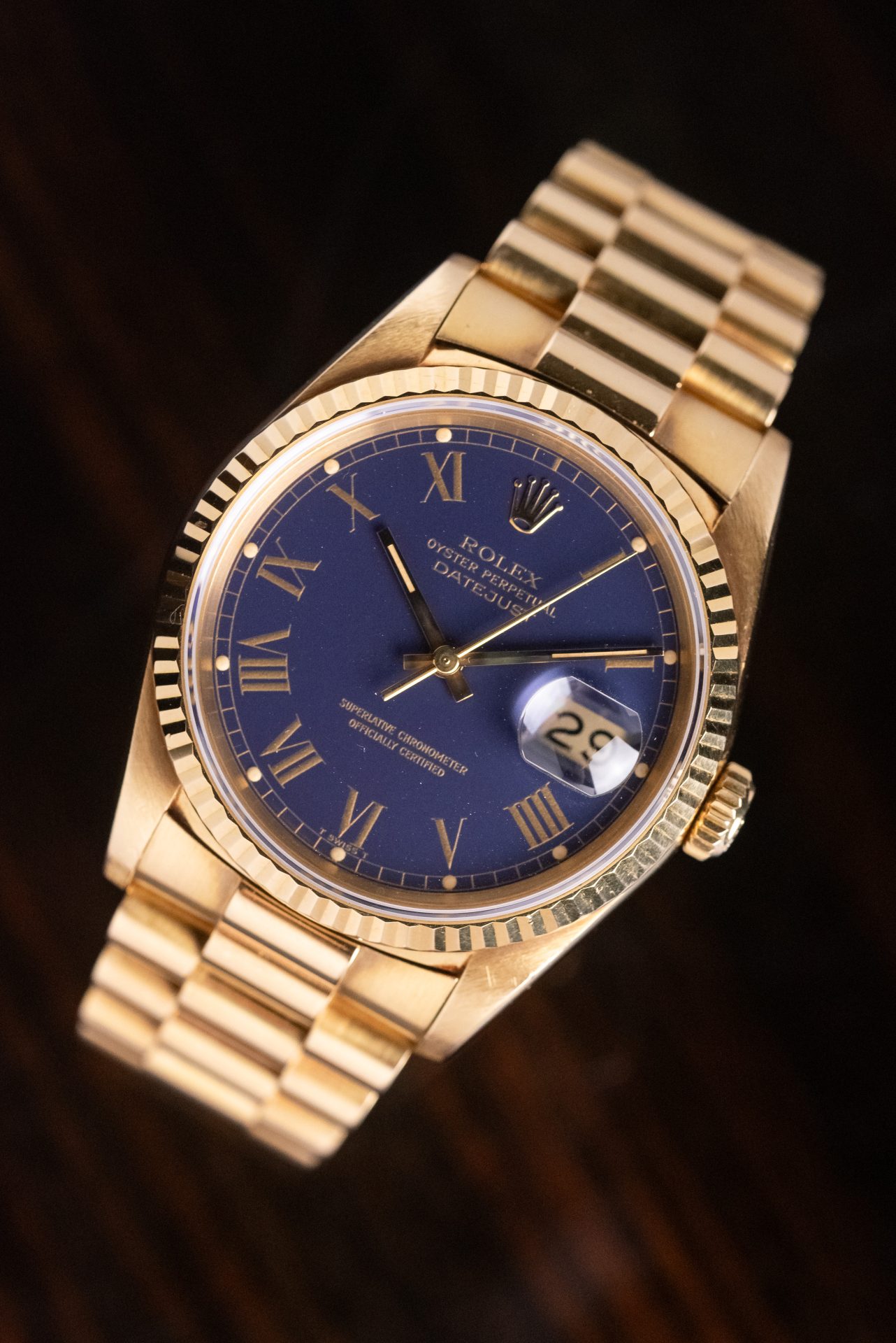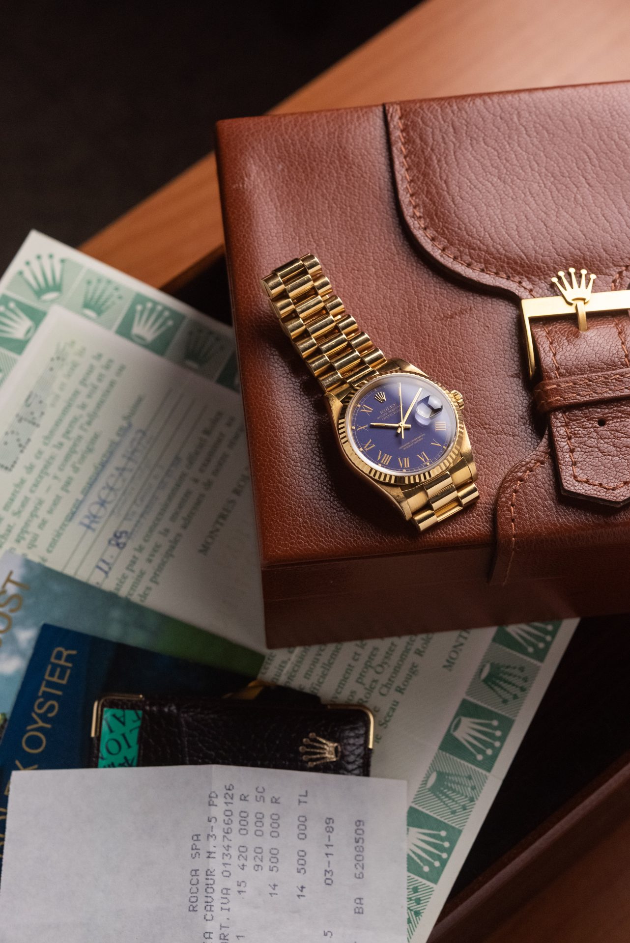 This is a Rolex DateJust Ref. 16238, an iconic piece from the 1980s. Crafted entirely from 18K yellow gold, it stands out for its Buckley dial with Roman numerals and gold hands that enhance its classic elegance. This timepiece comes with all its original period accessories, including a box, warranty, and original receipt from the historic Rocca di Padova jewelry store. A piece that embodies charm, history, and authenticity, a perfect example of Rolex’s prestige and refinement.