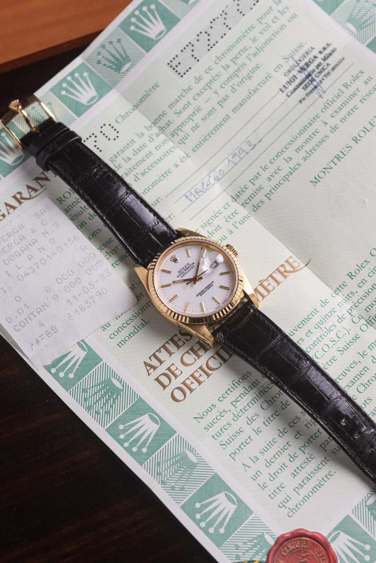 This elegant Rolex DateJust Ref. 16238 from 1993 represents one of the most refined versions of the classic 18K yellow gold model. The white dial with gold-plated baton indexes and the fluted bezel create a perfect balance between simplicity and prestige. The watch is a Full Set, complete with original box, warranty, and documents. A rare and fascinating detail: it still retains the green sales sticker applied to the caseback, a detail that testifies to its originality and excellent condition. A true gem for connoisseurs and collectors of vintage watches.