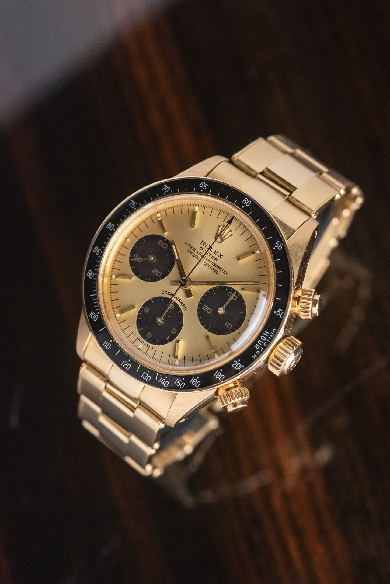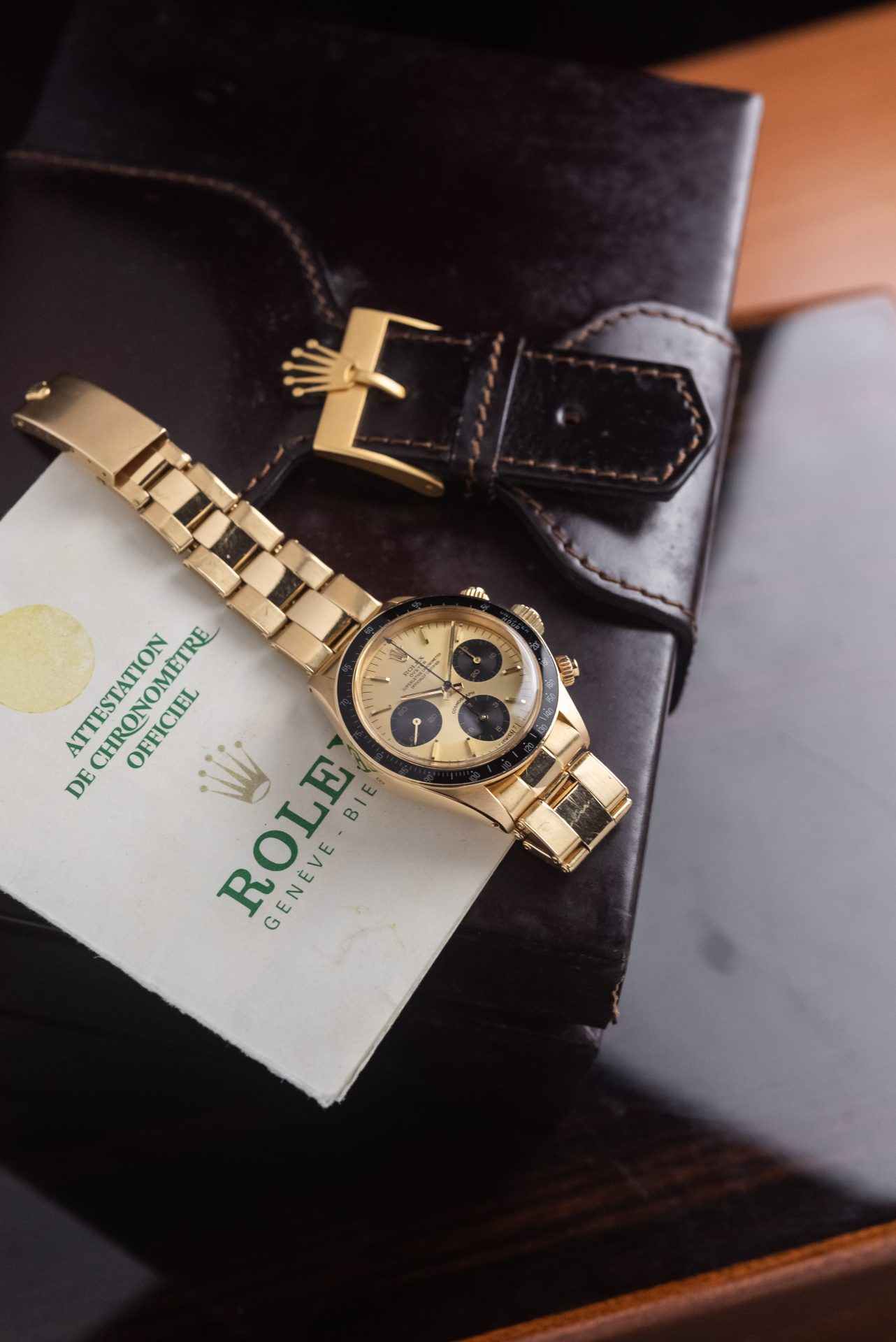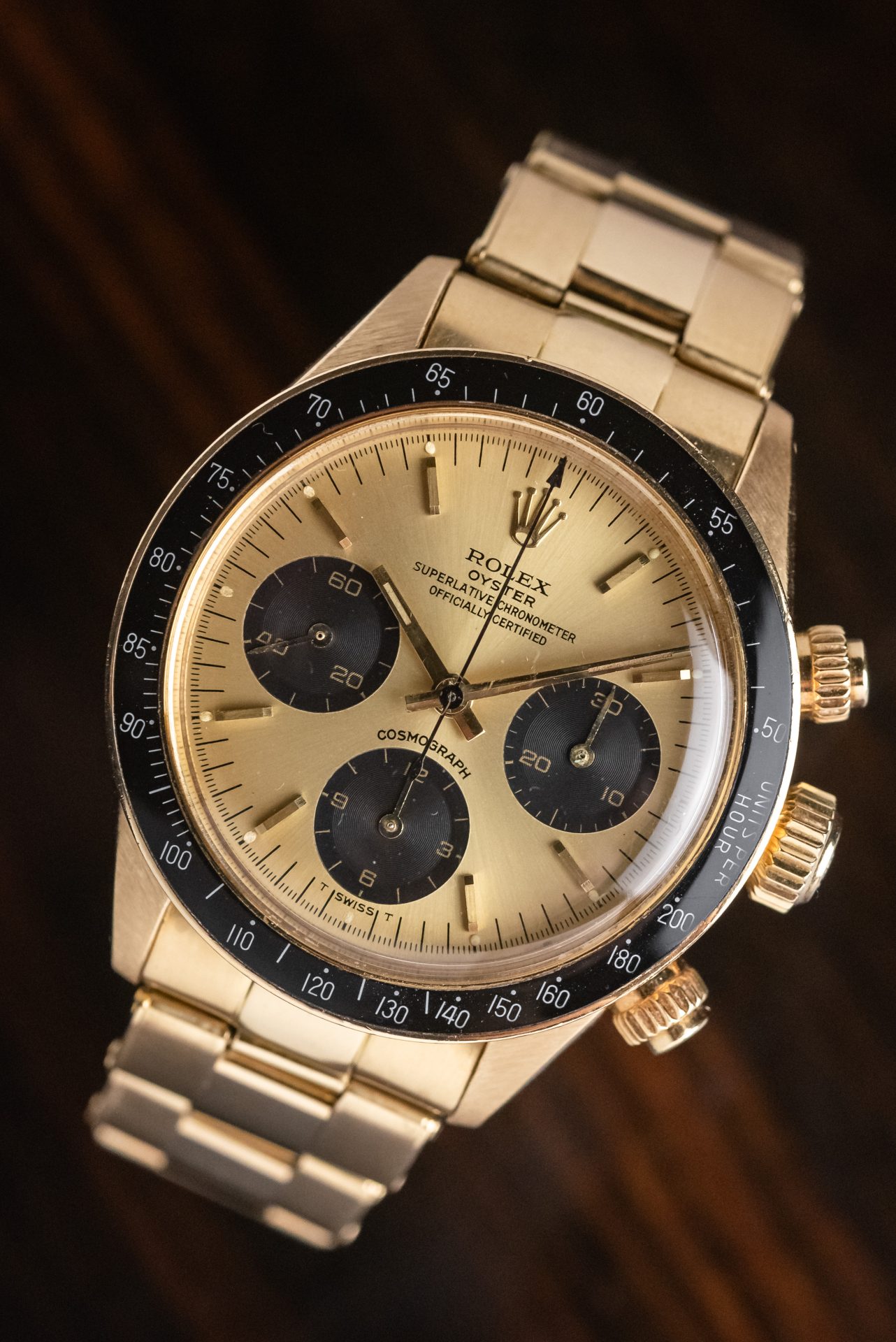 This stunning 1978 6263 Full Set in 18K yellow gold represents one of the rarest and most captivating expressions of the Rolex sports chronograph. The warm glow of gold combines with the black tachymeter bezel and champagne dial with contrasting subdials, creating a perfect balance between elegance and racing spirit. Produced in extremely limited numbers, the gold reference 6263 is today an absolute icon of refined and timeless vintage collectibles. Its full set status further enhances its historical and collectible value.