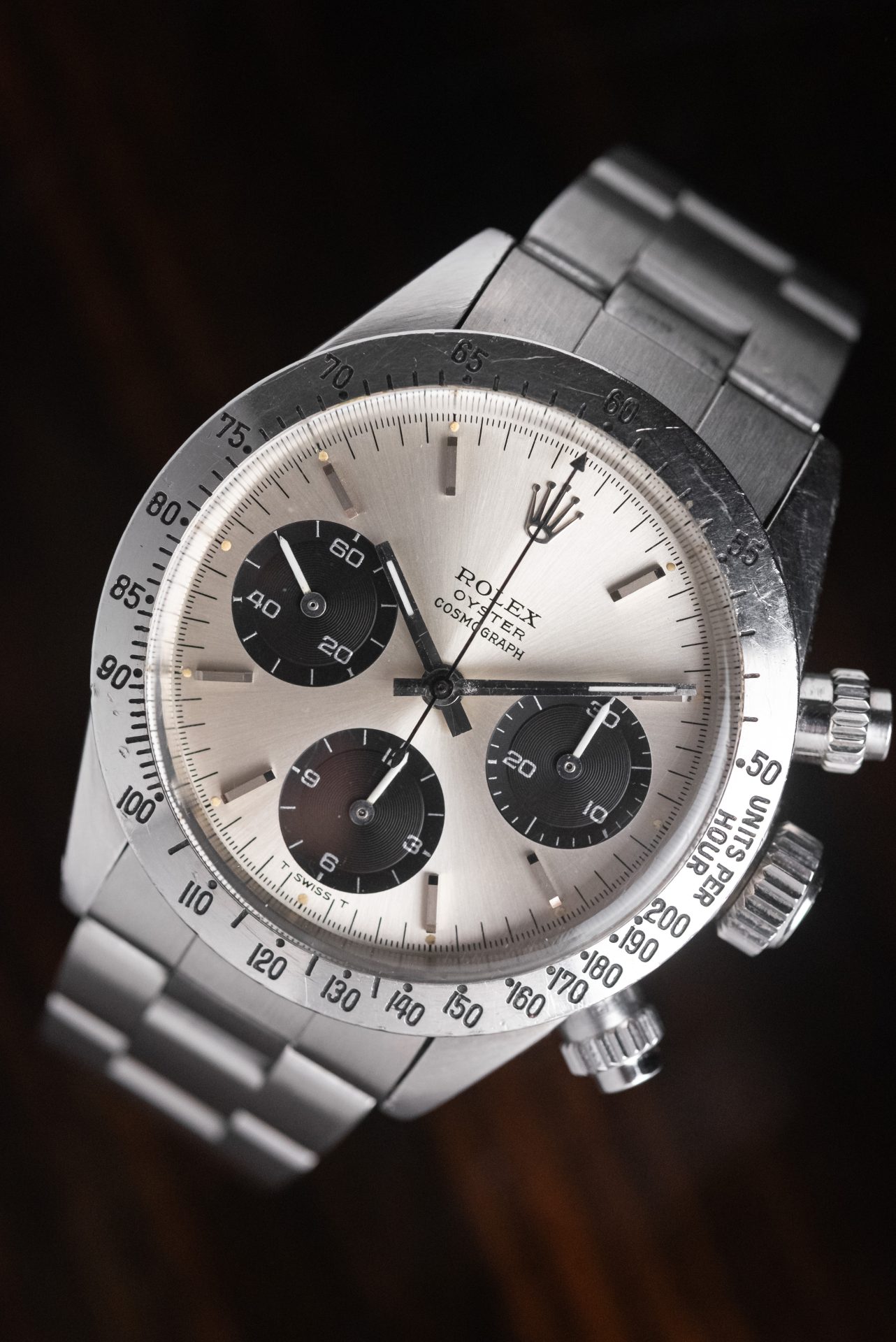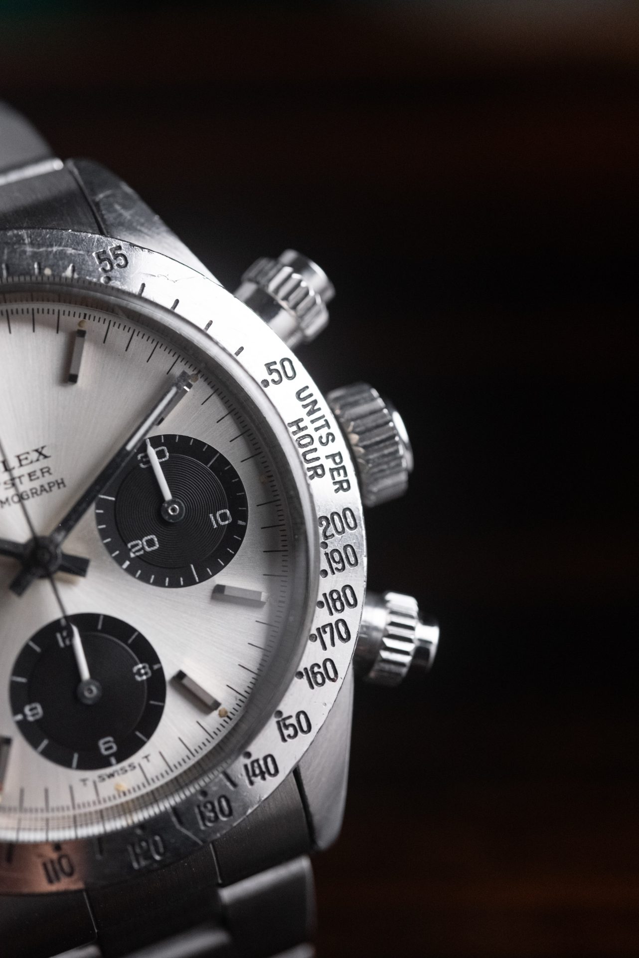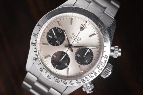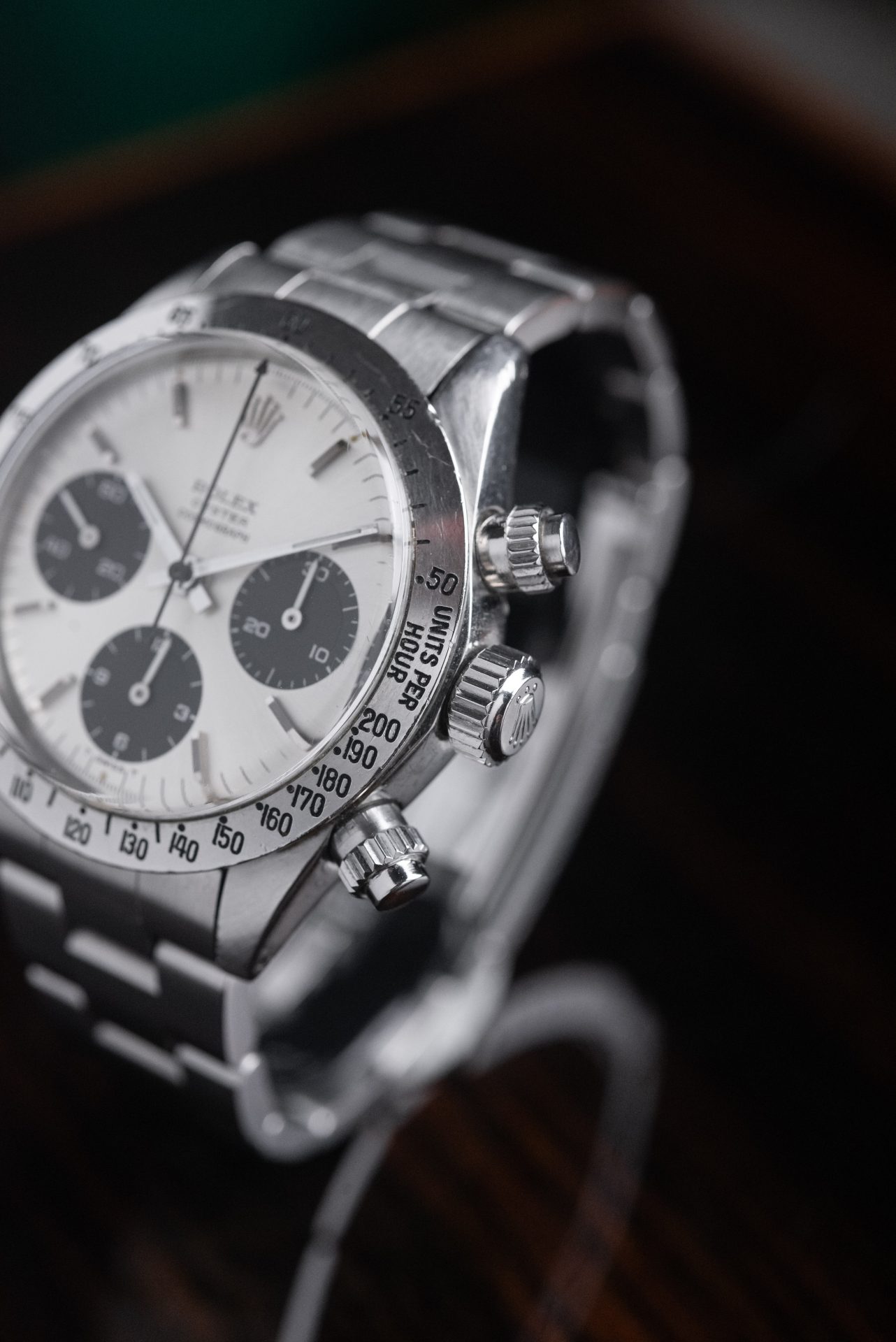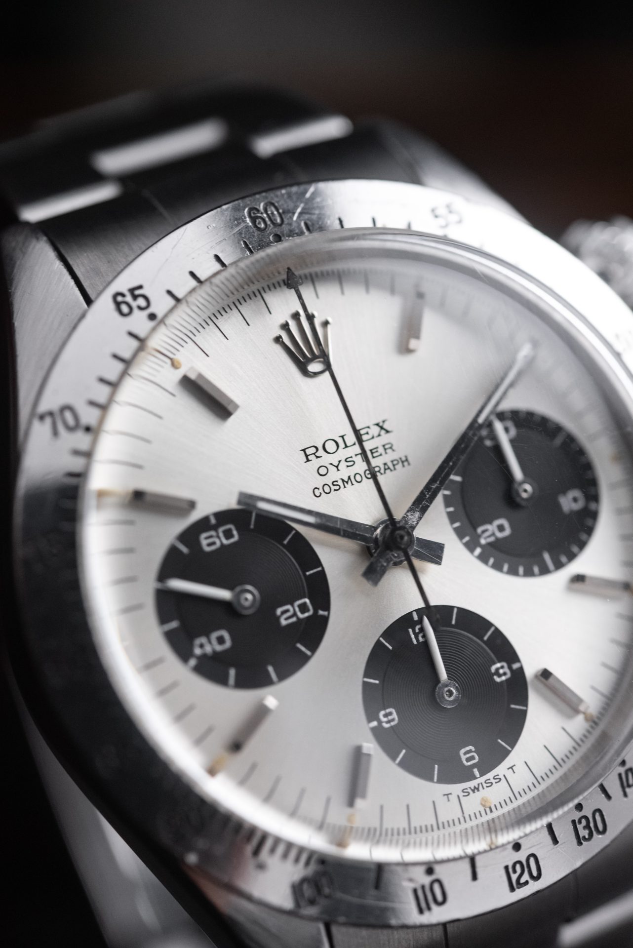 The 1973 Rolex Daytona 6265 is one of the most iconic vintage chronographs. With its stainless steel case, engraved tachymeter bezel, and distinctive screw-down pushers, it embodies the essence of the hand-wound Daytona. The silver dial with black subdials offers a perfect contrast, both elegant and sporty. Highly sought-after by collectors, the 6265 combines historic charm, pure design, and the robustness of the renowned Valjoux 727 caliber. A true symbol of vintage watchmaking.
