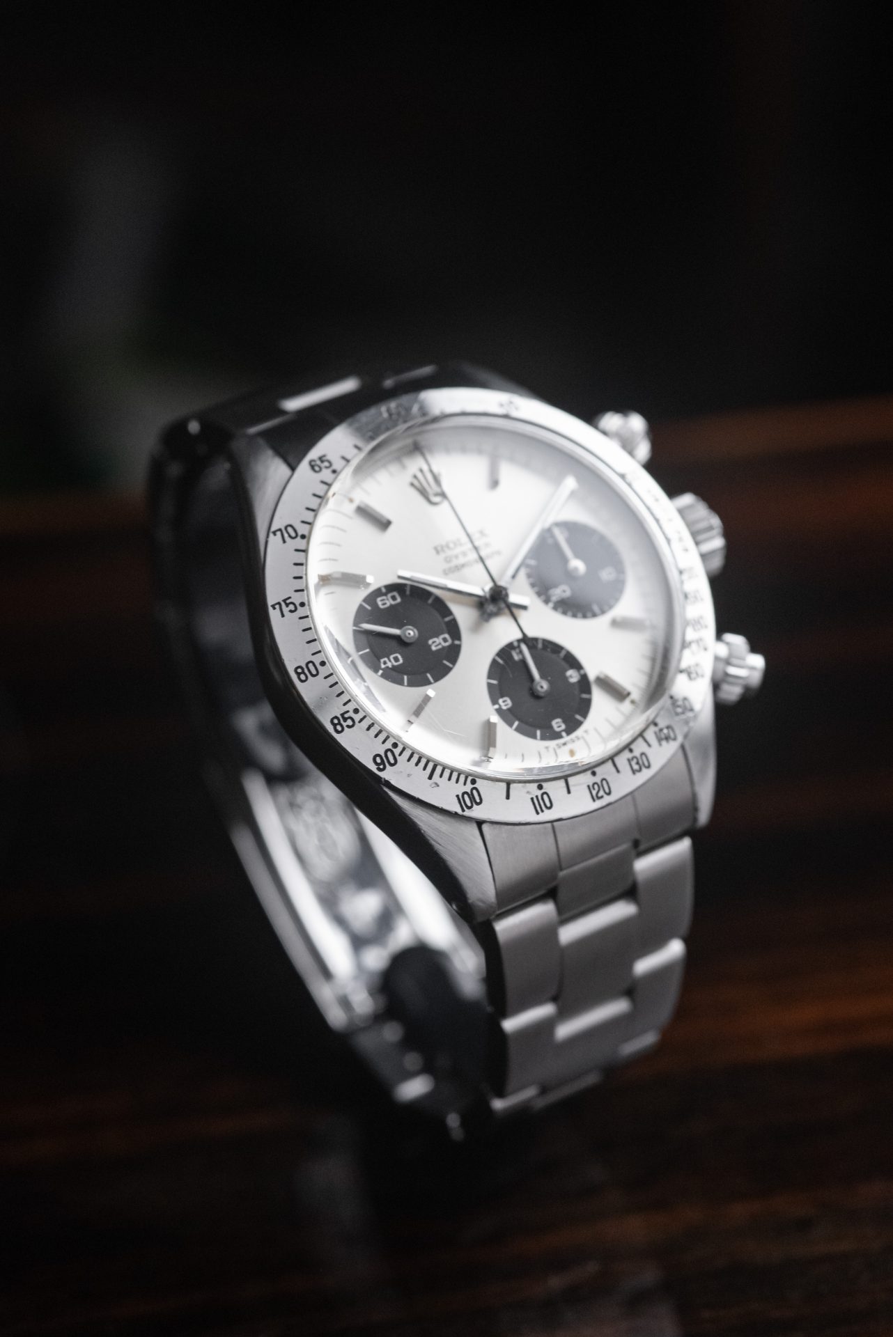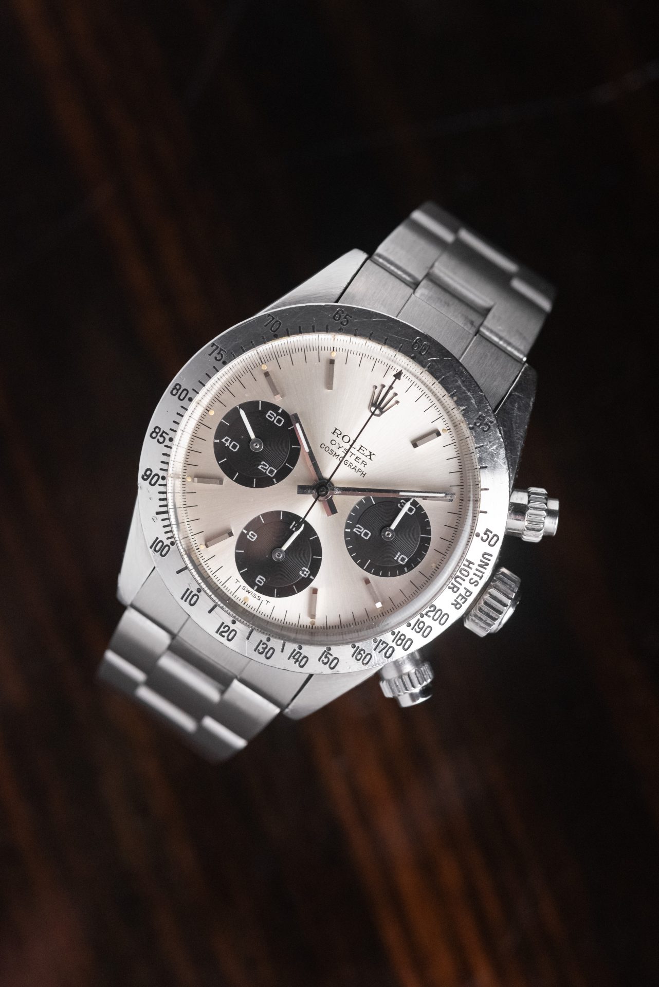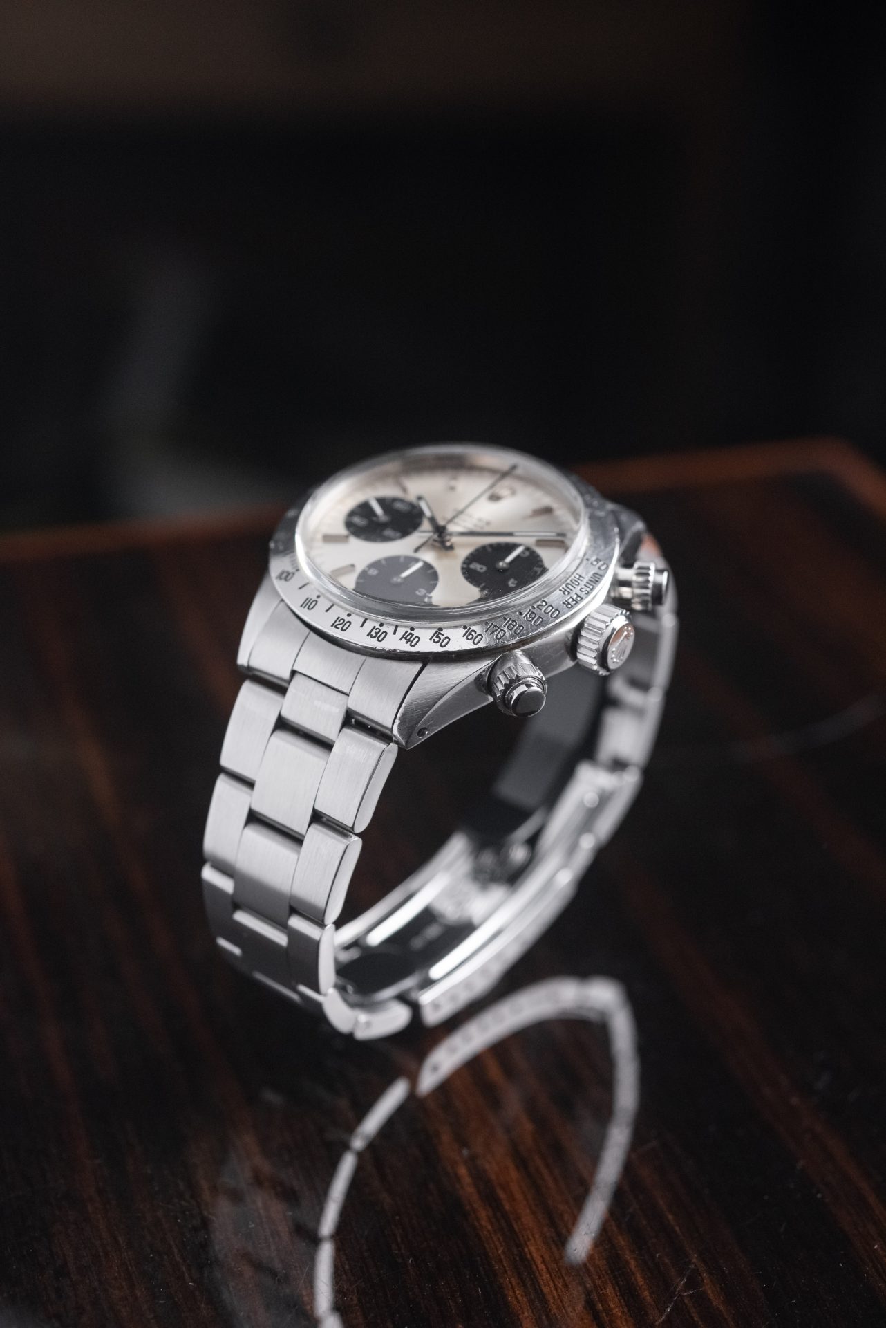 The 1973 Rolex Daytona 6265 is one of the most iconic vintage chronographs. With its stainless steel case, engraved tachymeter bezel, and distinctive screw-down pushers, it embodies the essence of the hand-wound Daytona. The silver dial with black subdials offers a perfect contrast, both elegant and sporty. Highly sought-after by collectors, the 6265 combines historic charm, pure design, and the robustness of the renowned Valjoux 727 caliber. A true symbol of vintage watchmaking.
