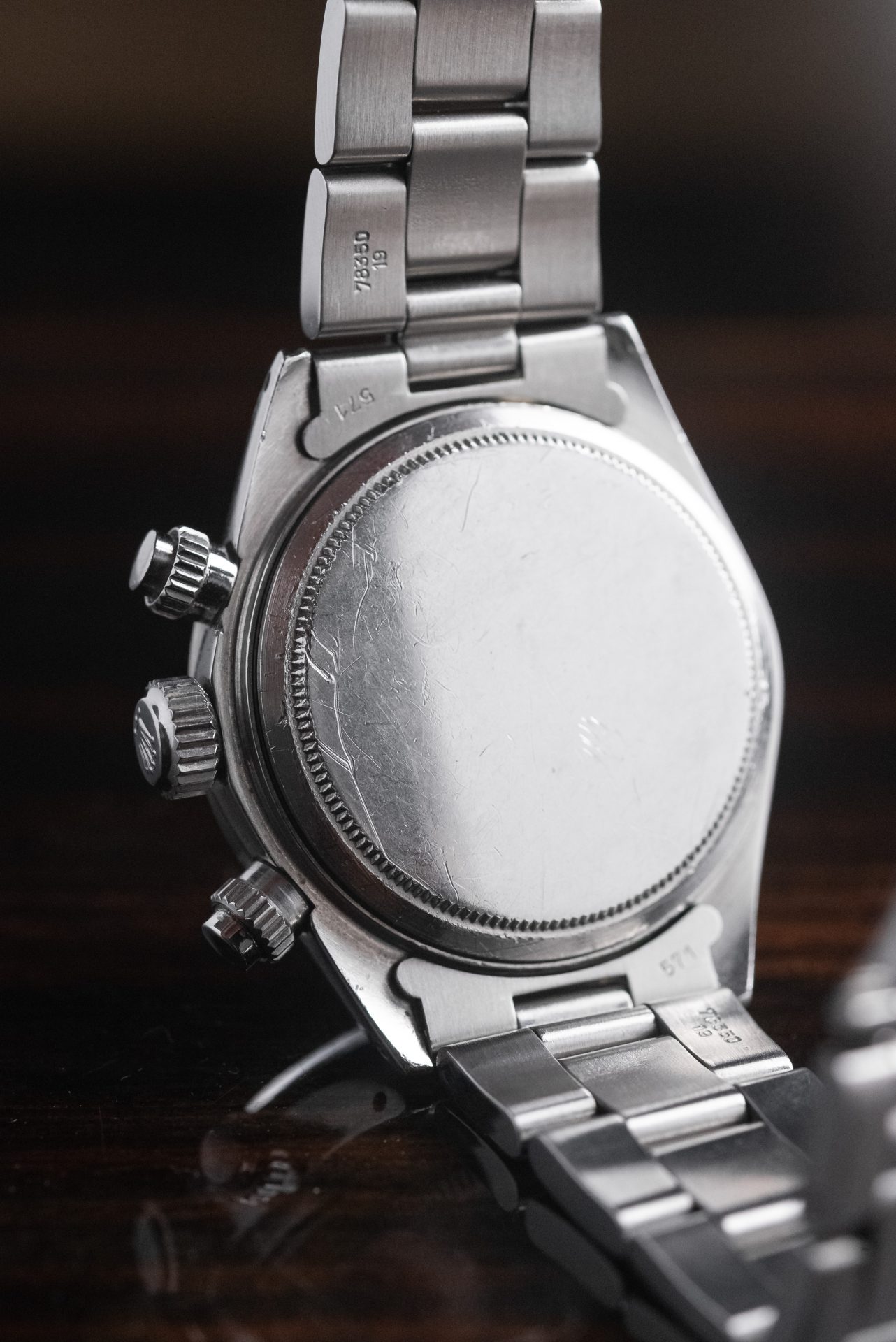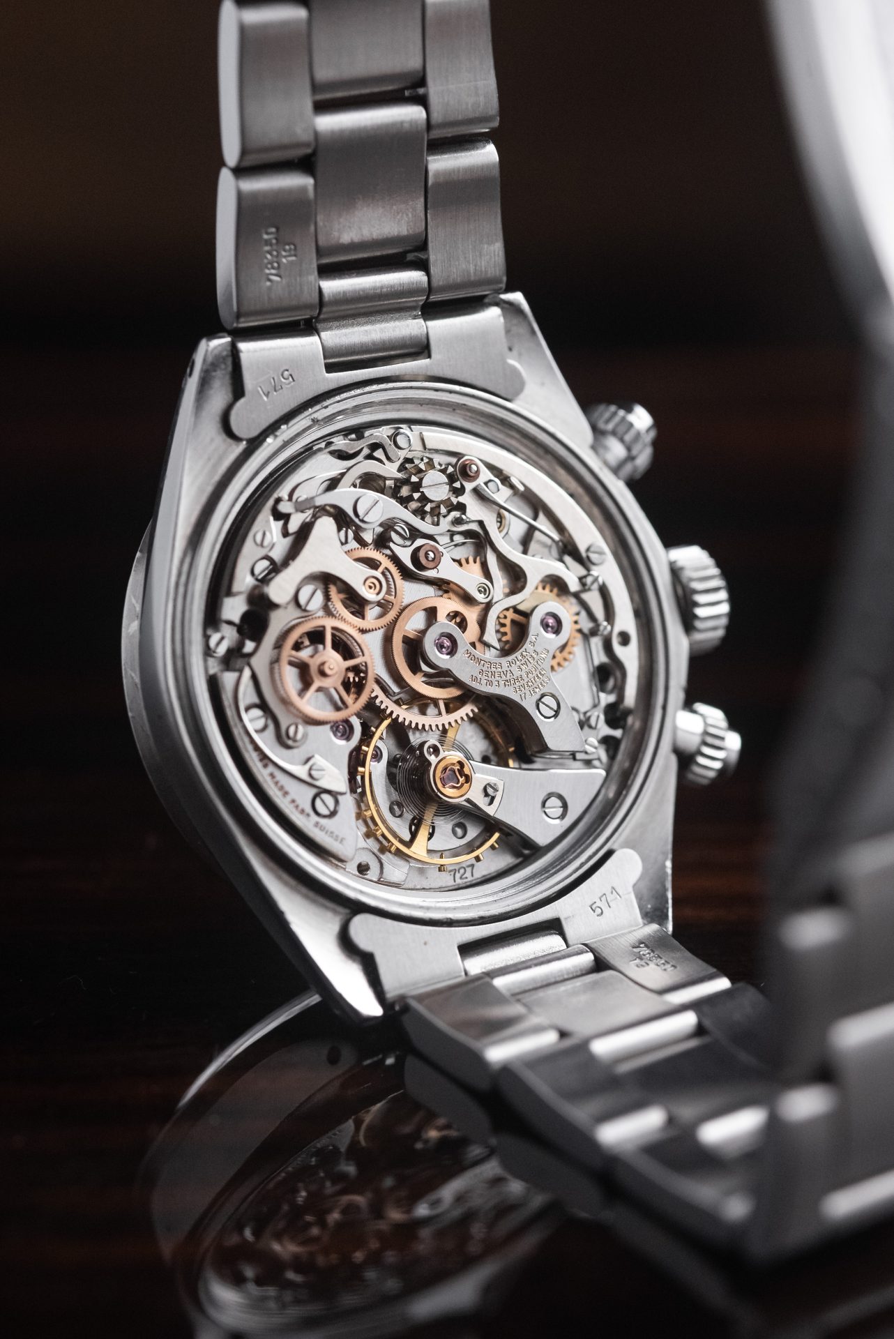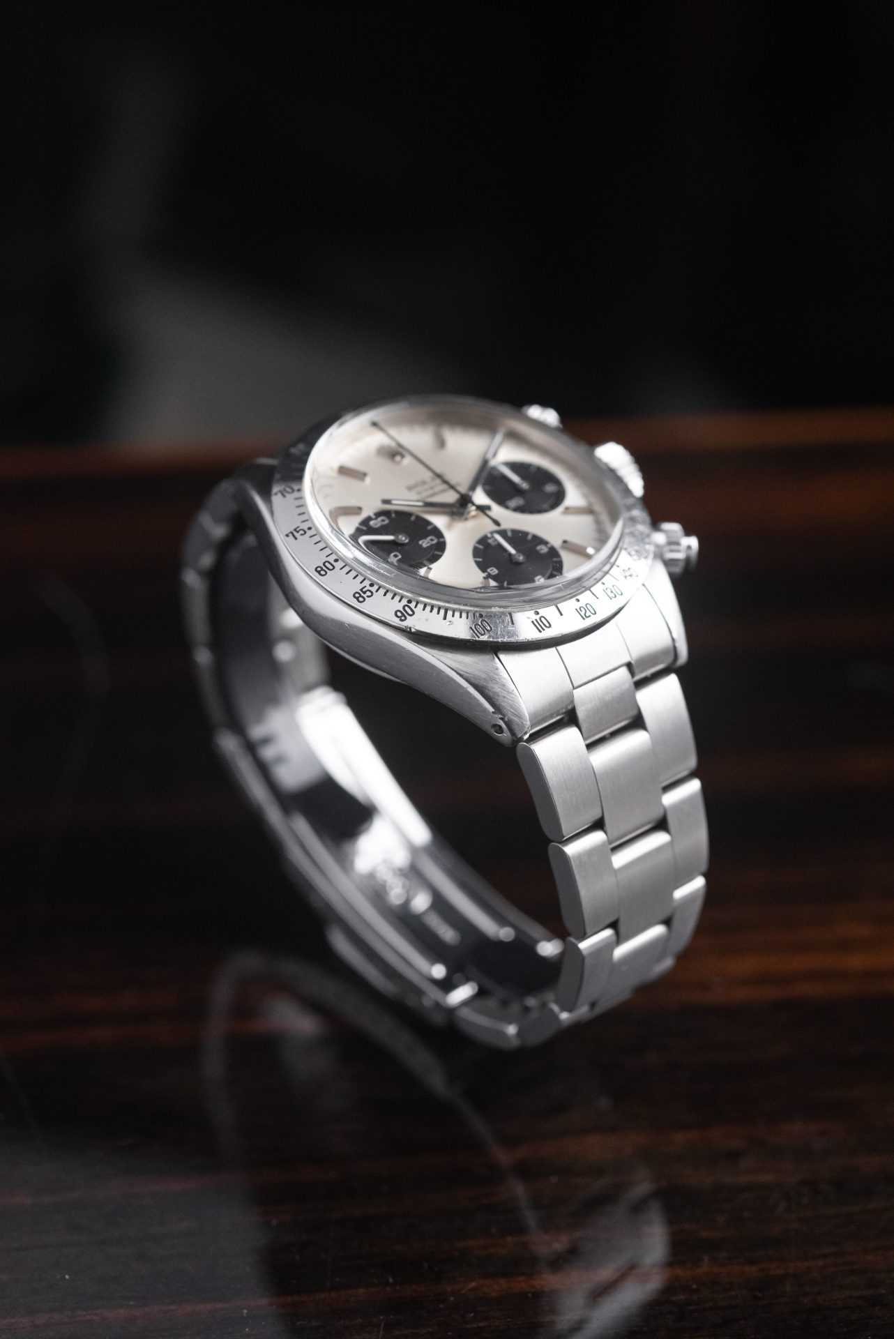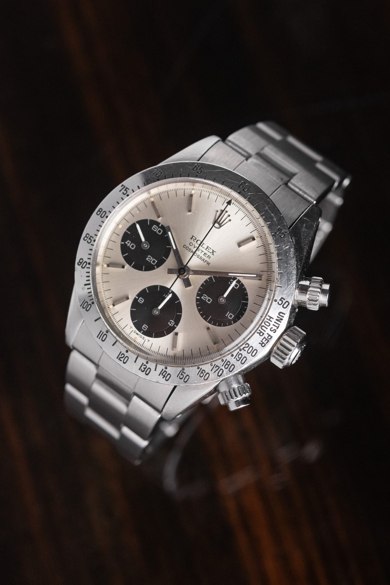 The 1973 Rolex Daytona 6265 is one of the most iconic vintage chronographs. With its stainless steel case, engraved tachymeter bezel, and distinctive screw-down pushers, it embodies the essence of the hand-wound Daytona. The silver dial with black subdials offers a perfect contrast, both elegant and sporty. Highly sought-after by collectors, the 6265 combines historic charm, pure design, and the robustness of the renowned Valjoux 727 caliber. A true symbol of vintage watchmaking.