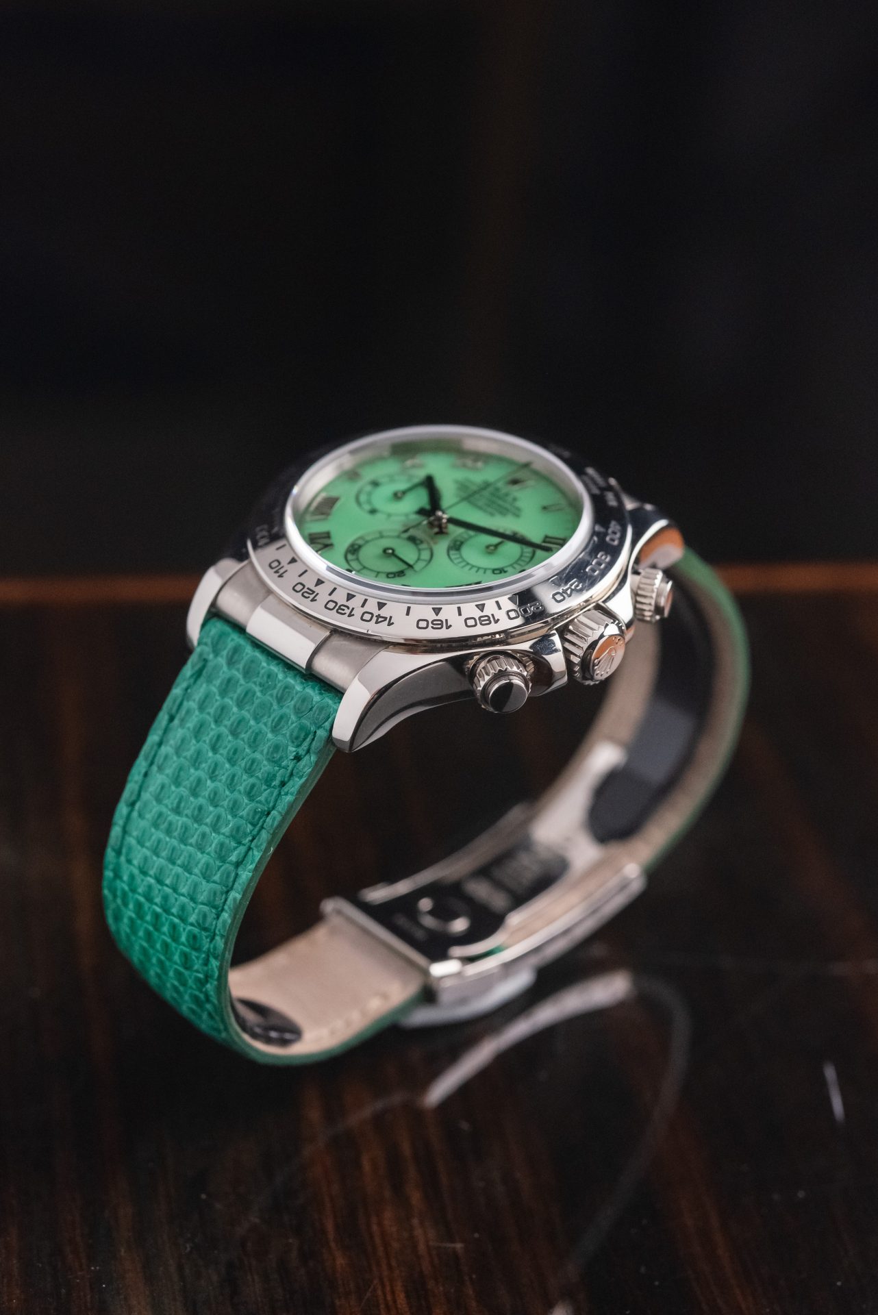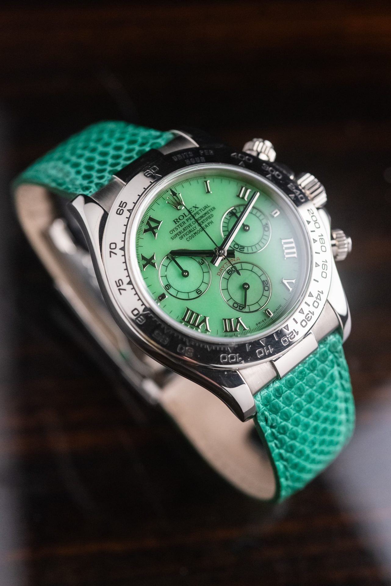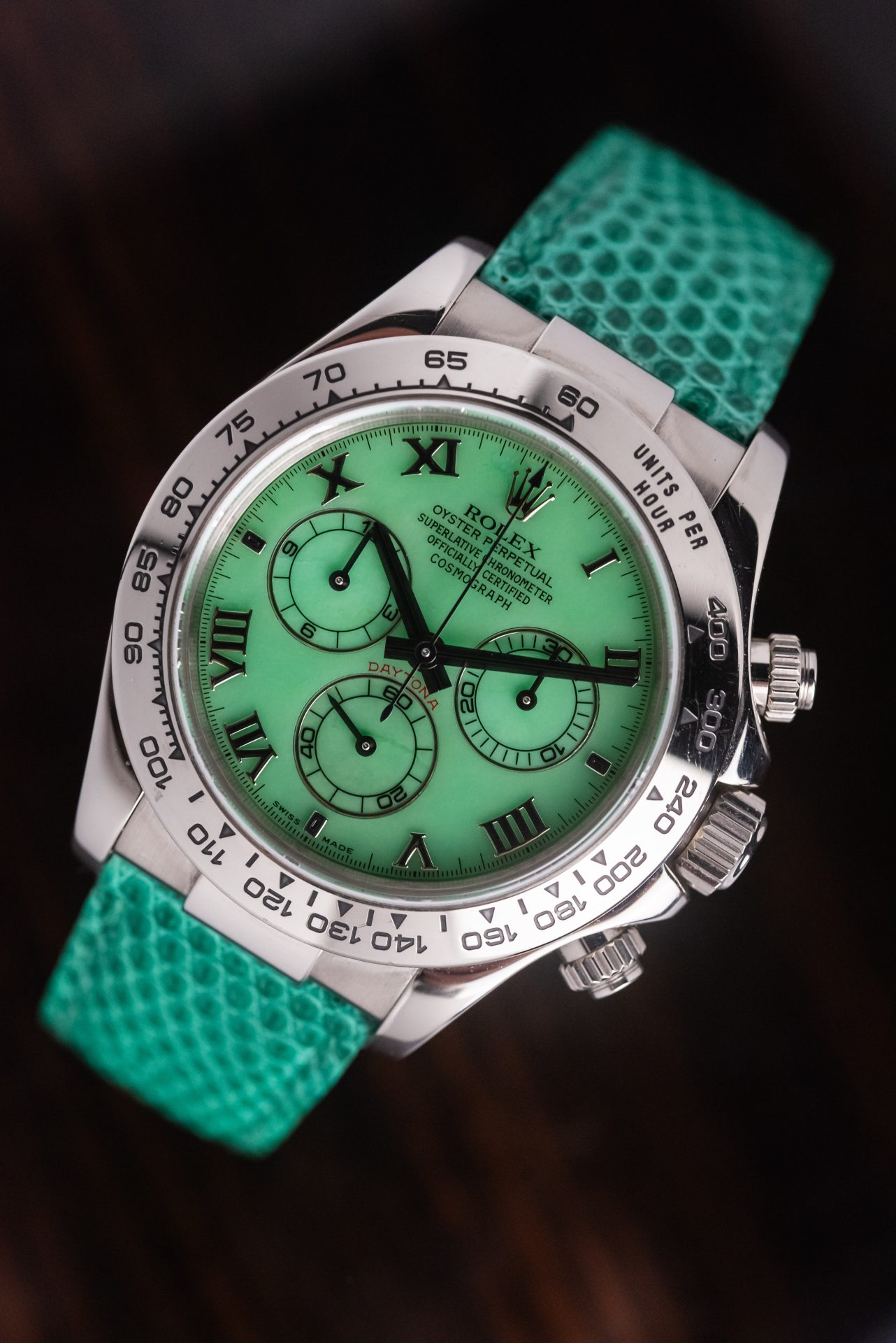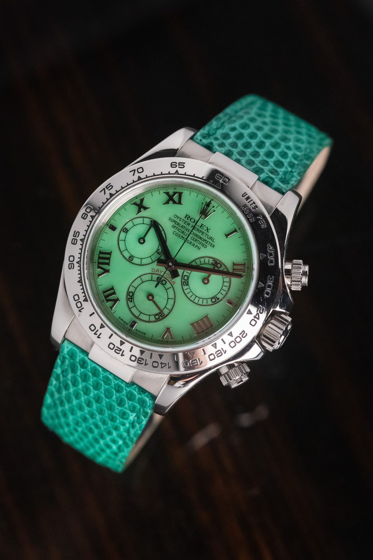 A stunning Daytona Beach in absolutely excellent condition, featuring a rare chrysoprase dial with Roman numerals. This extremely rare natural stone in watchmaking makes it almost legendary when mounted on a Daytona, making each piece unique and unrepeatable in terms of hue, grain, and depth of color.
