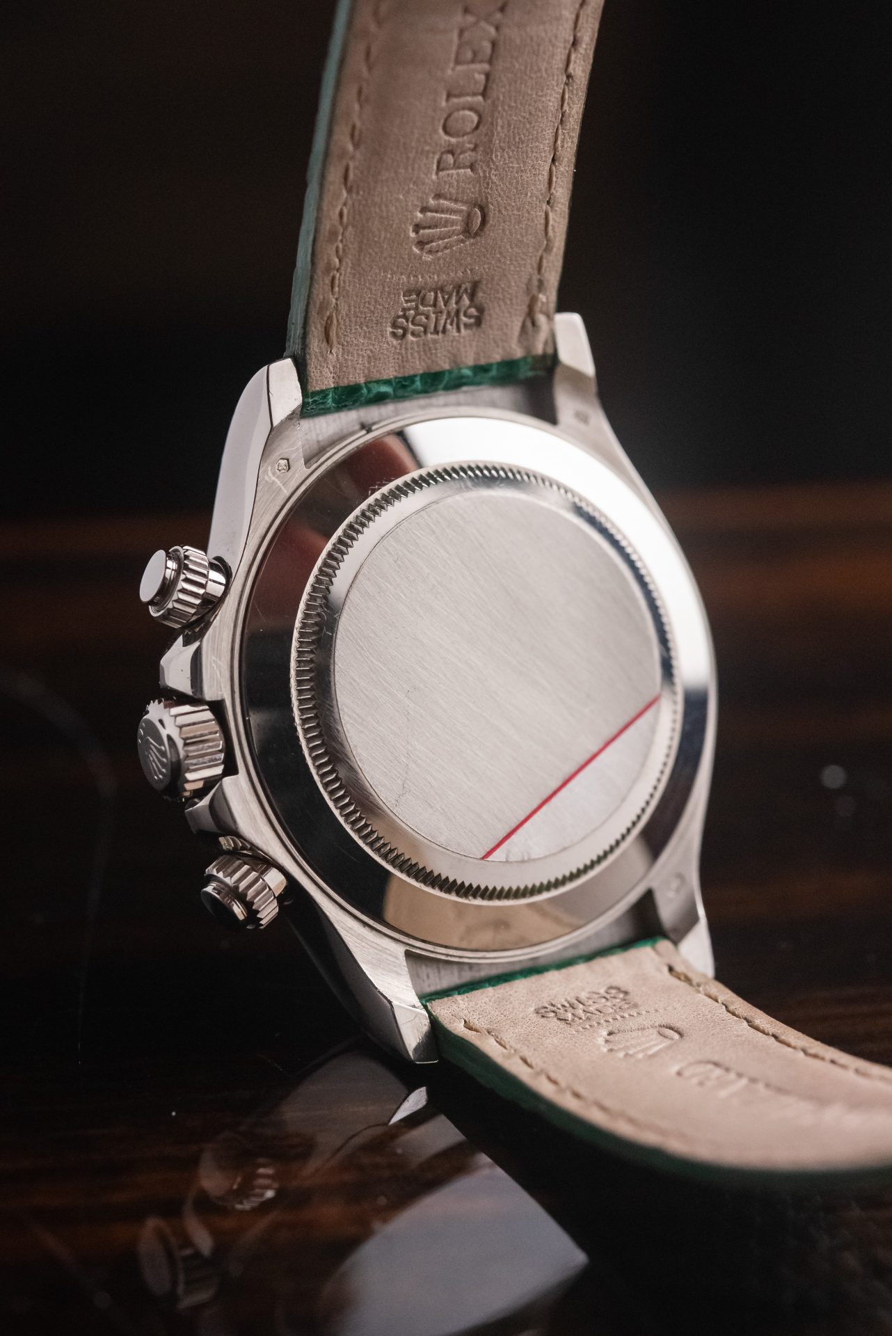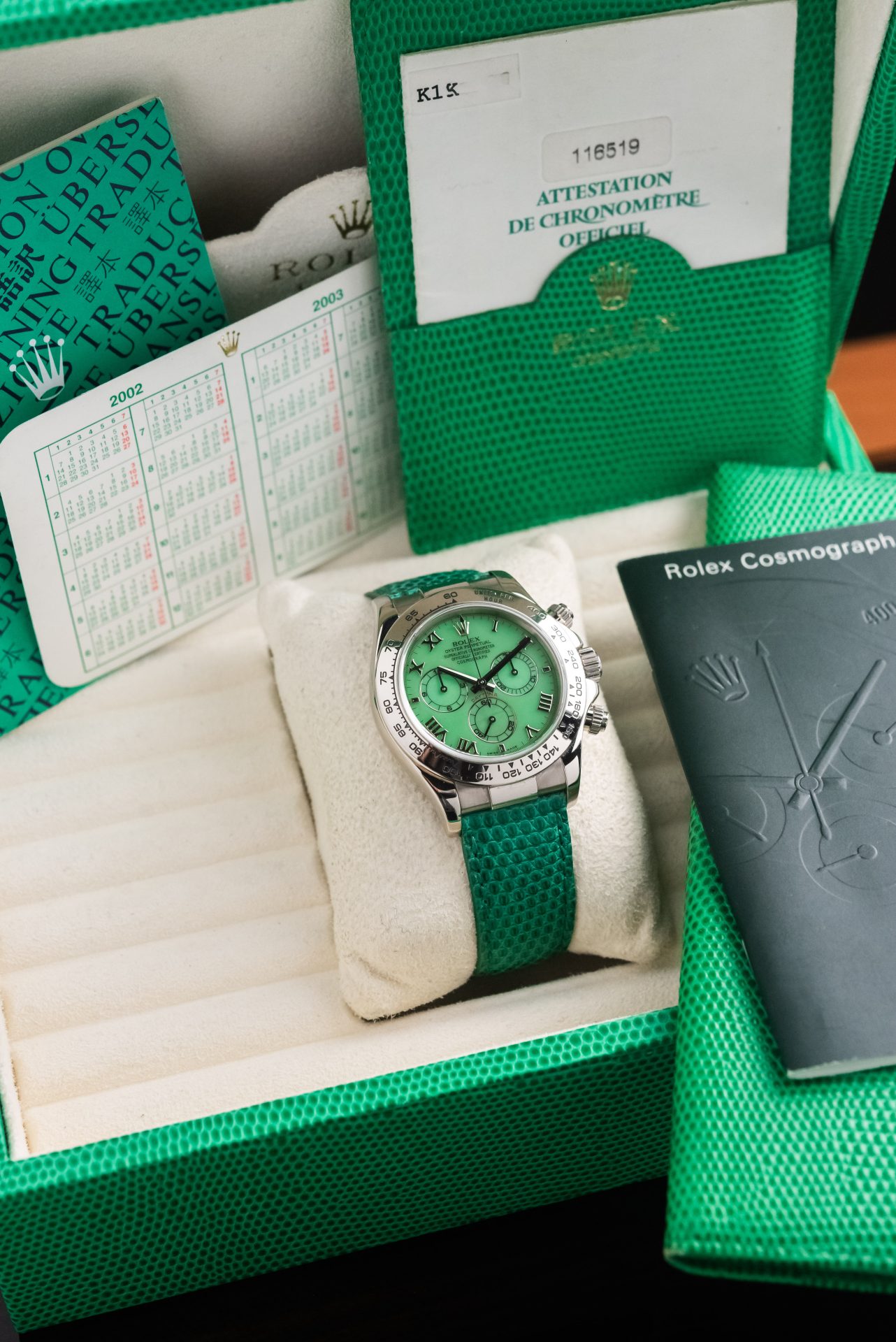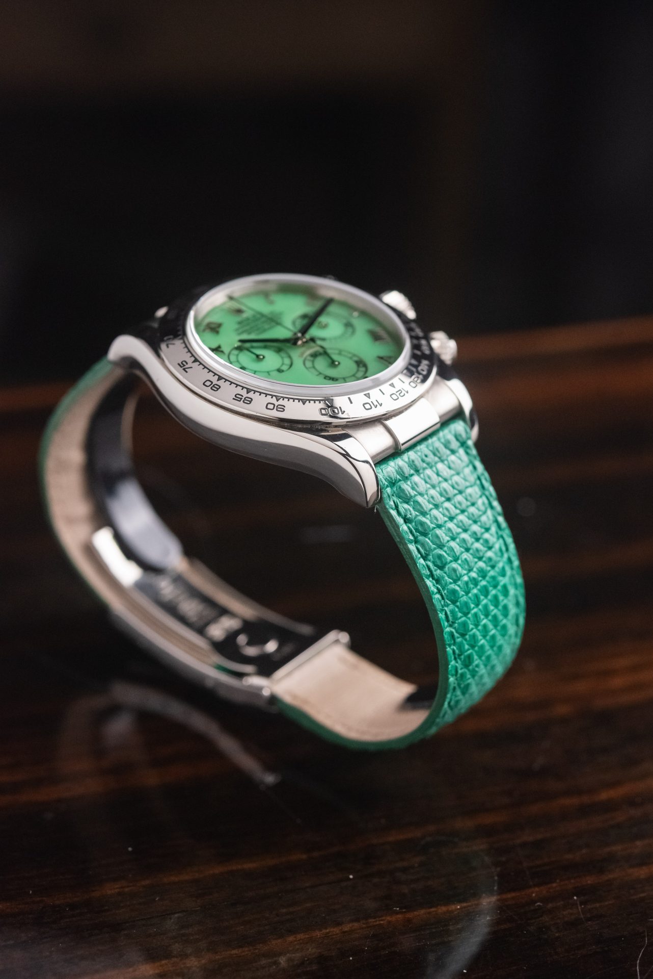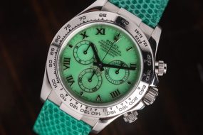 A stunning Daytona Beach in absolutely excellent condition, featuring a rare chrysoprase dial with Roman numerals. This extremely rare natural stone in watchmaking makes it almost legendary when mounted on a Daytona, making each piece unique and unrepeatable in terms of hue, grain, and depth of color.