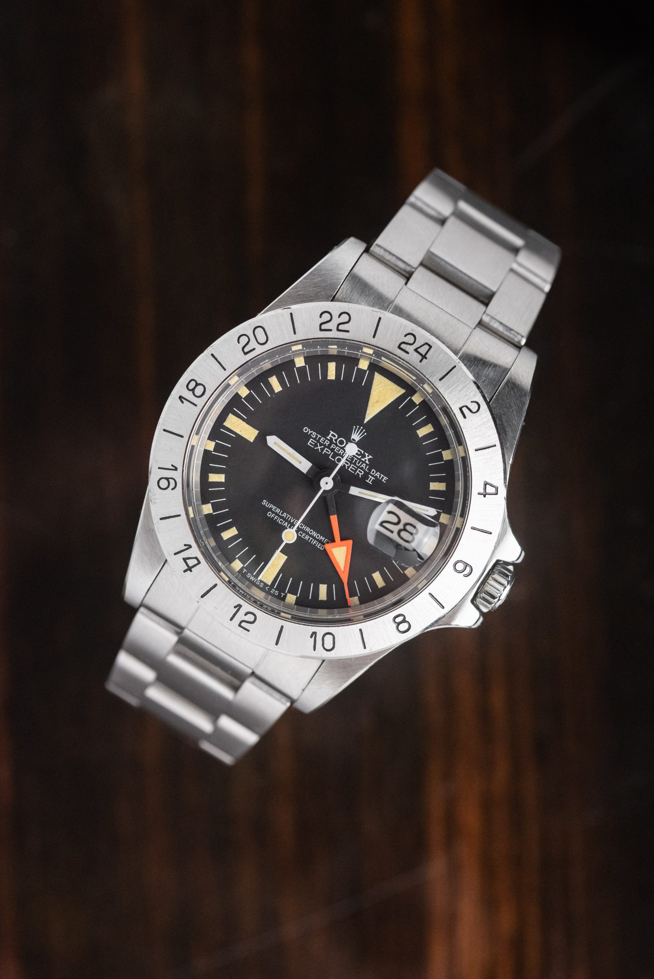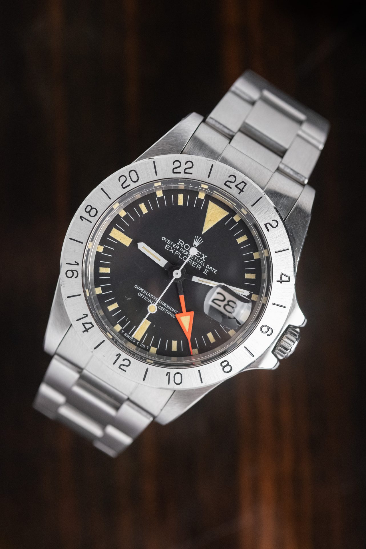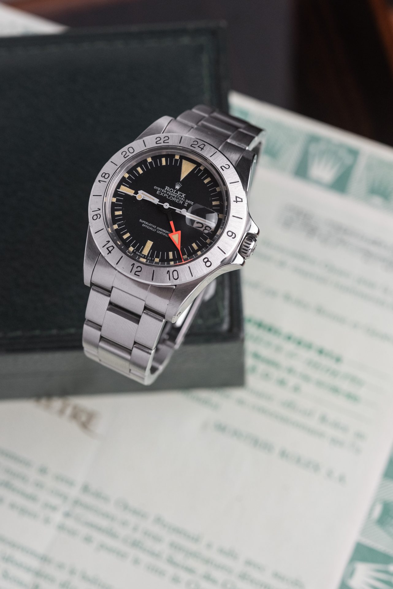 Magnificent Rolex Explorer II 1655 from 1982 in the famous Freccione configuration, known as the Freccione due to its distinctive orange GMT hand. An iconic and highly sought-after model, it represents one of the most fascinating references in vintage Rolex sports watches.