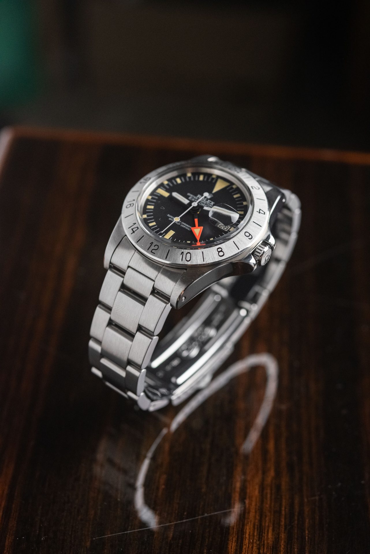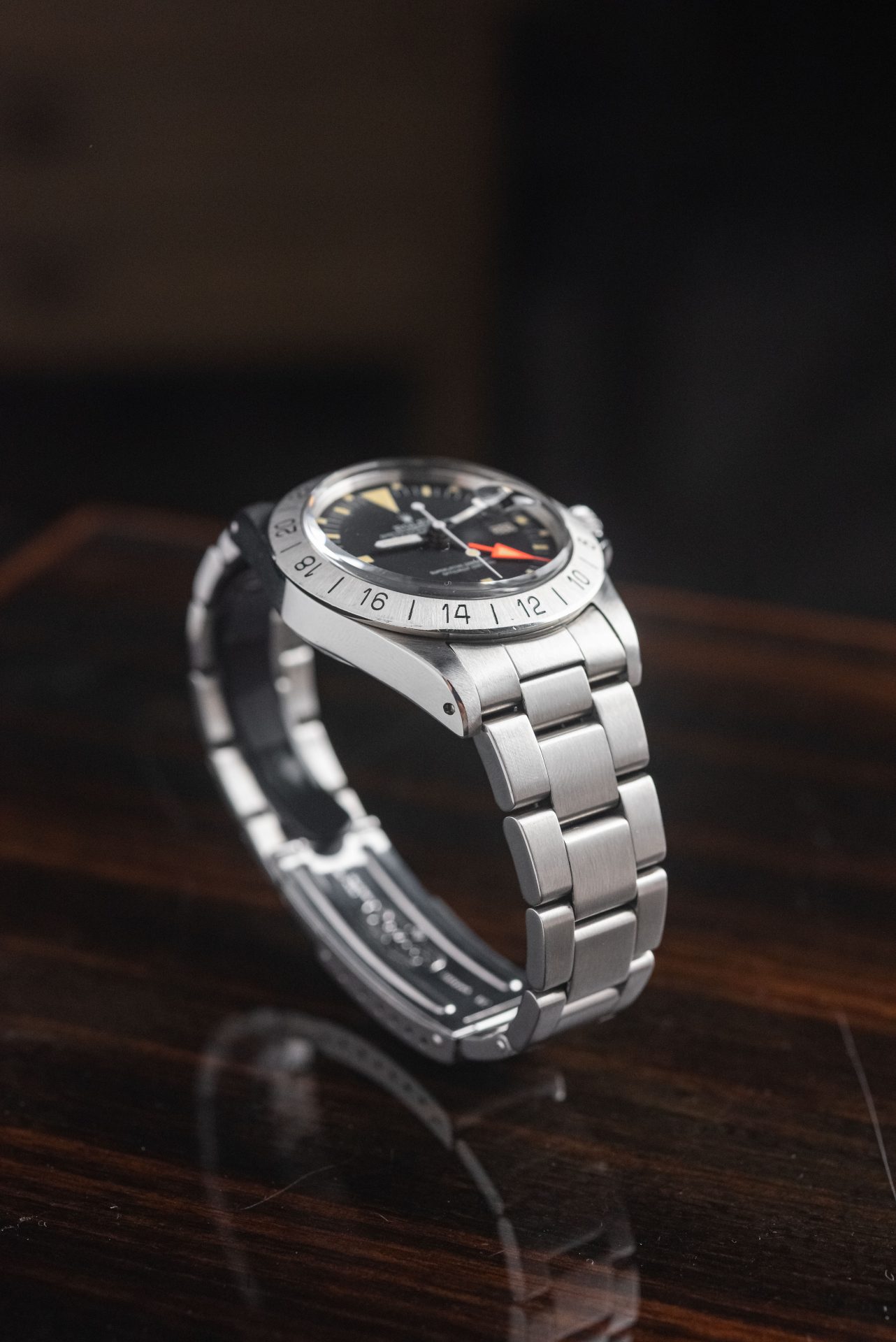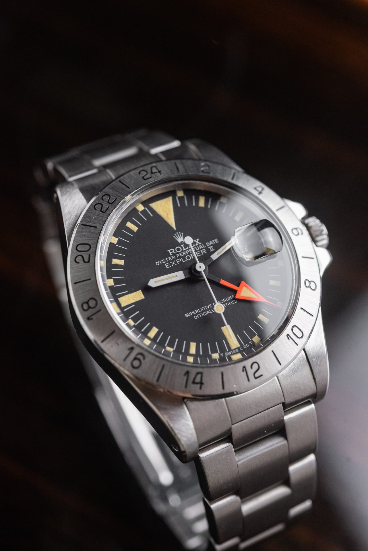 Magnificent Rolex Explorer II 1655 from 1982 in the famous Freccione configuration, known as the Freccione due to its distinctive orange GMT hand. An iconic and highly sought-after model, it represents one of the most fascinating references in vintage Rolex sports watches.